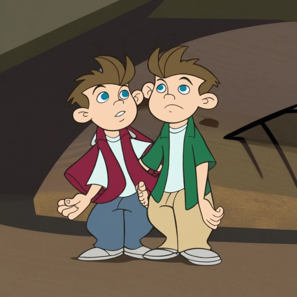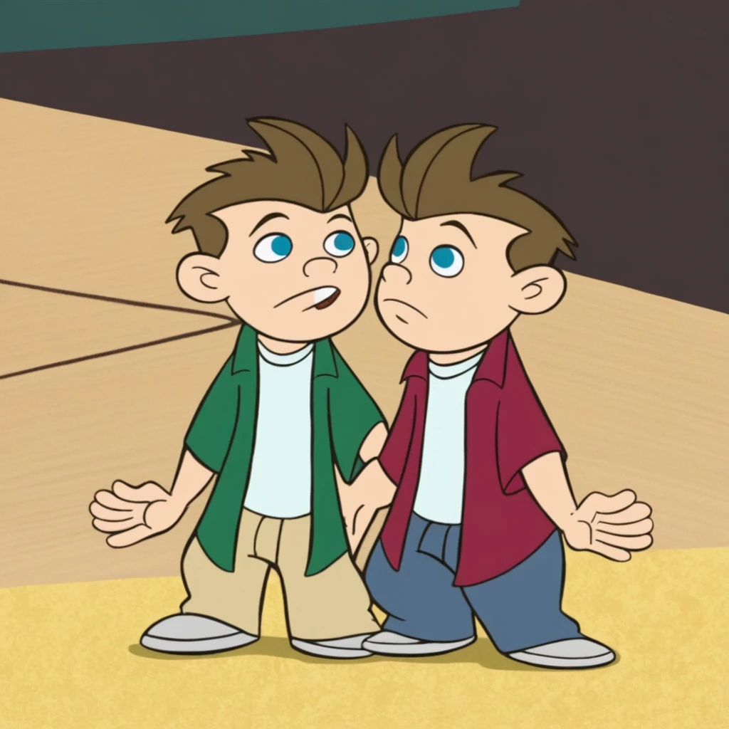 Multiple Boys, 2boys, Male focus, Jim and Tim Possible, Brown Hair, Blue Eyes, Open Clothes, White Shirt, Jacket, Pants,