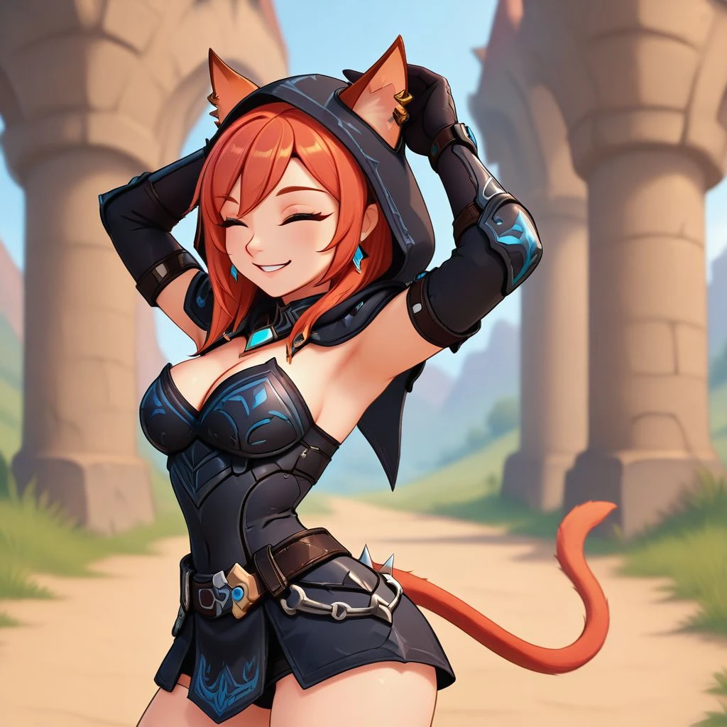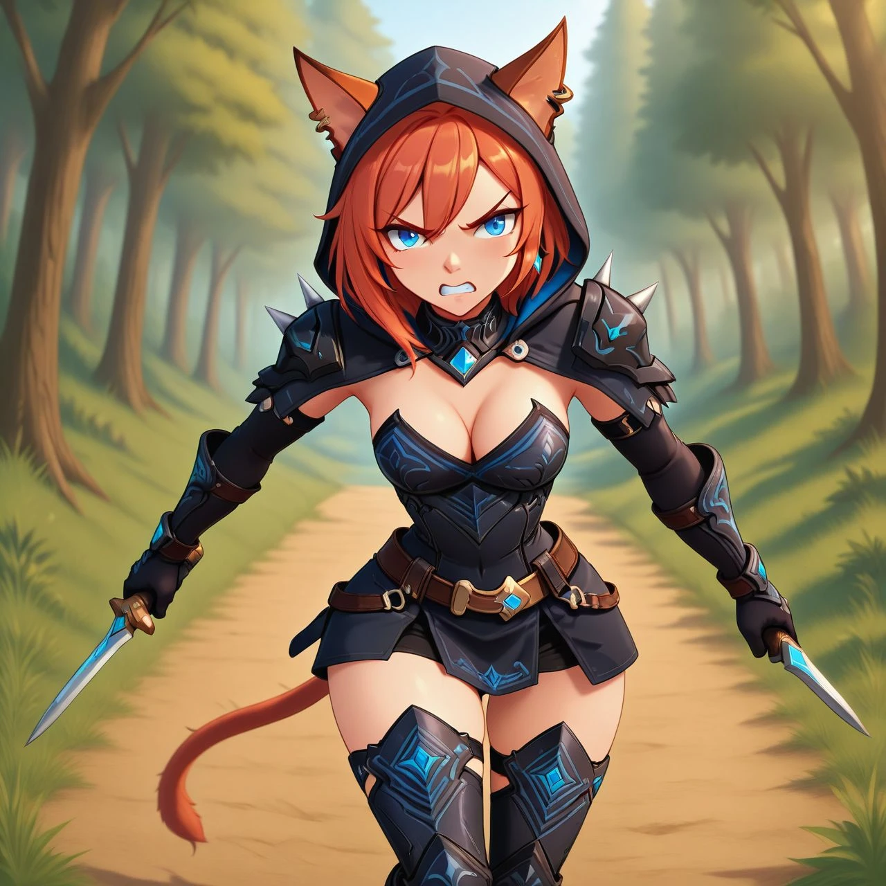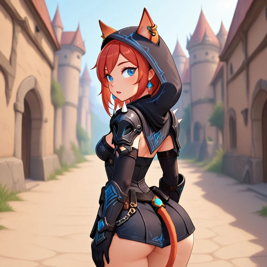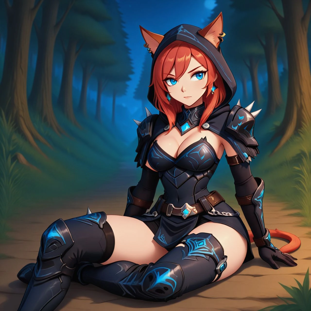 afryj_oc, cat ears, black armor, black clothes, elbow gloves, cleavage, red hair, blue eyes, earrings, boots, spikes, belt, hood, tail,