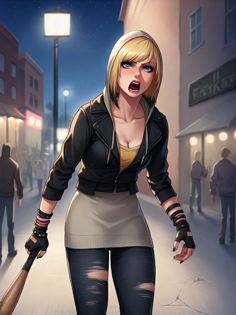 outfit: (grey) hoodie, (yellow) shirt, leather jacket, (purple striped) fingerless gloves, bracelets, (torn black) jeans, combat boots