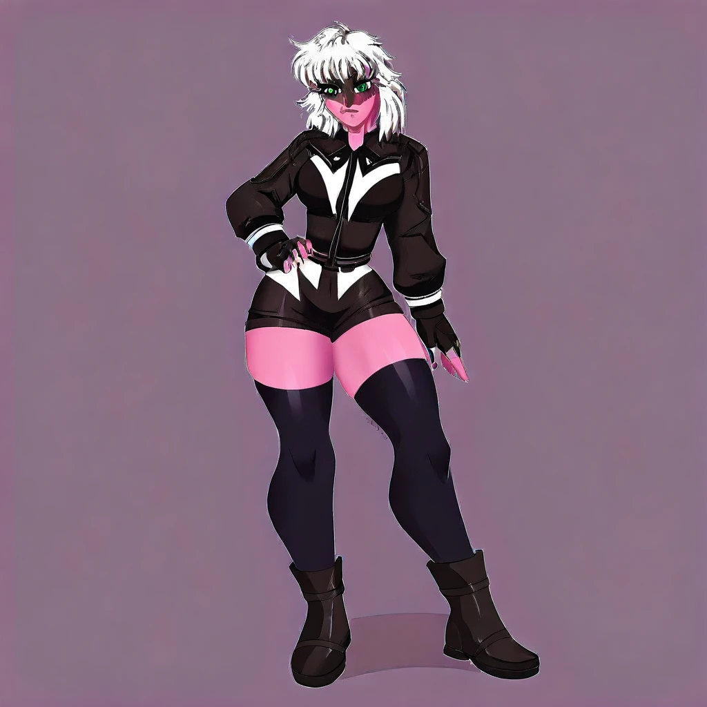 1girl, solo, harlowe, pink skin, white hair, black eye mask, green eyes, black jacket, long sleeves, black shorts, white stripes, black thighhighs, black fingerless gloves, black boots, breasts, hips