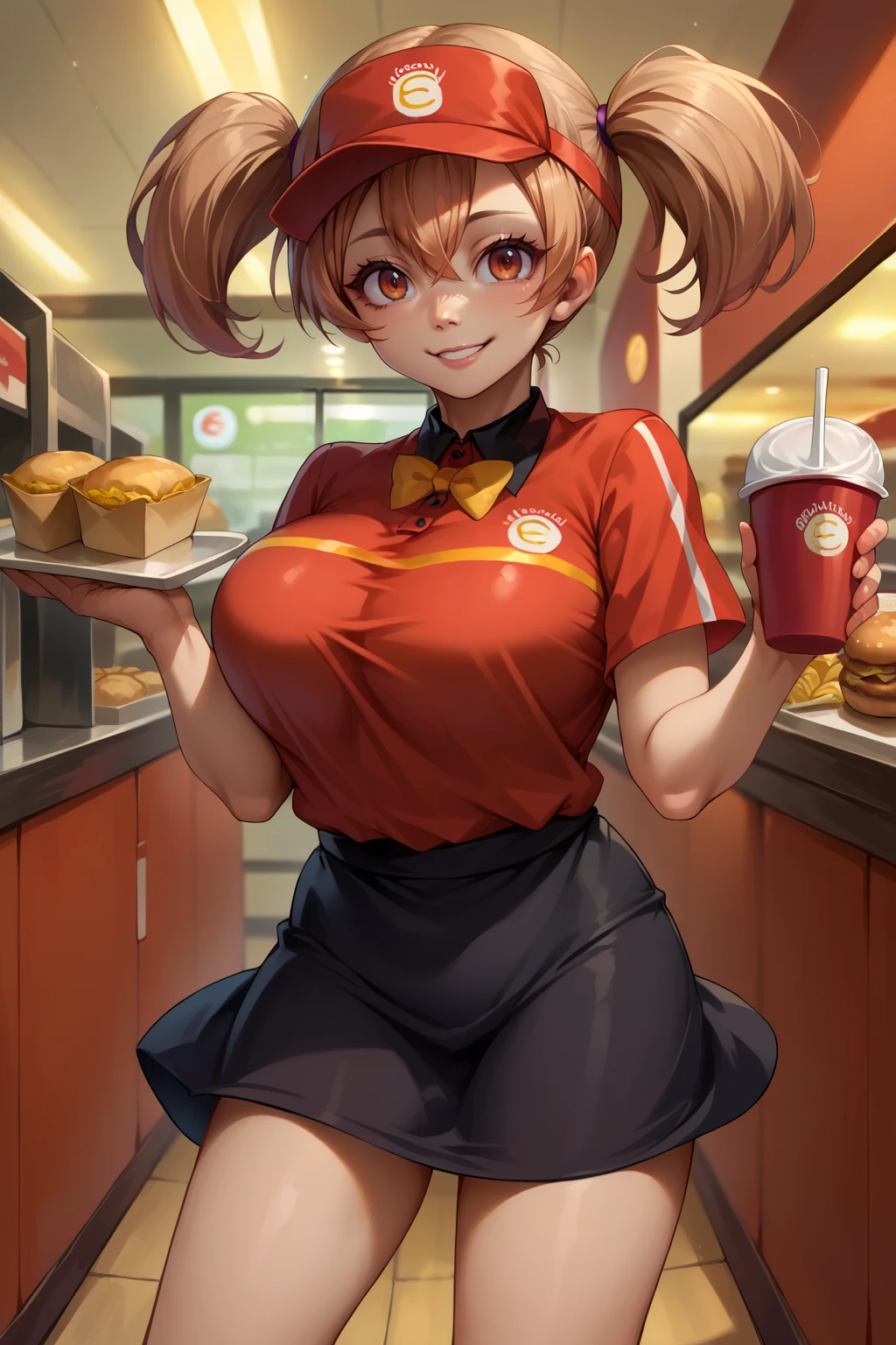 twintails, employee uniform, visor cap, polo shirt, bow, black skirt, socks