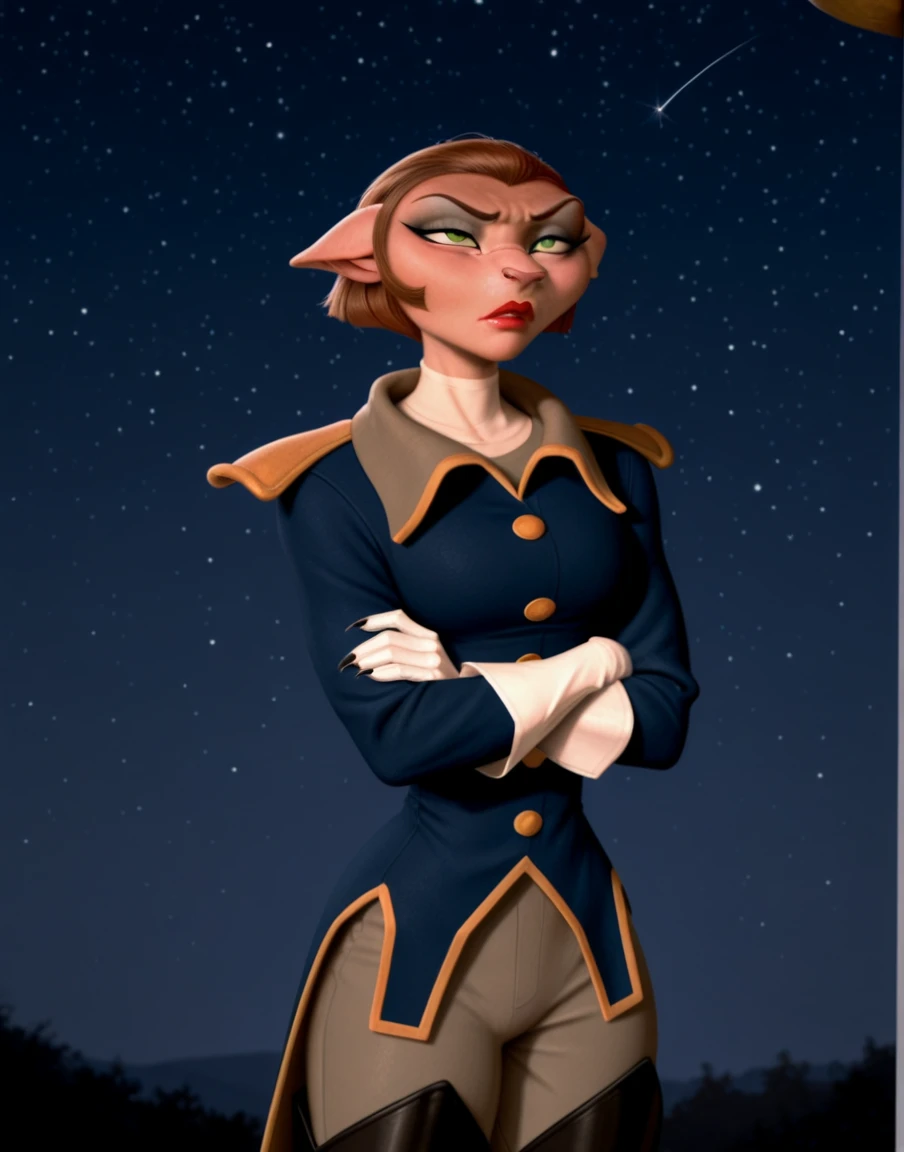 The only other real important tags are uniform, green eyes, and female. There's also a couple tags for her boots. Putting in just thigh boots works mostly for images from the thigh up. use the full high heeled thigh boots for a more full shot of her standing. Of course you can use other species and clothing tags if you want.