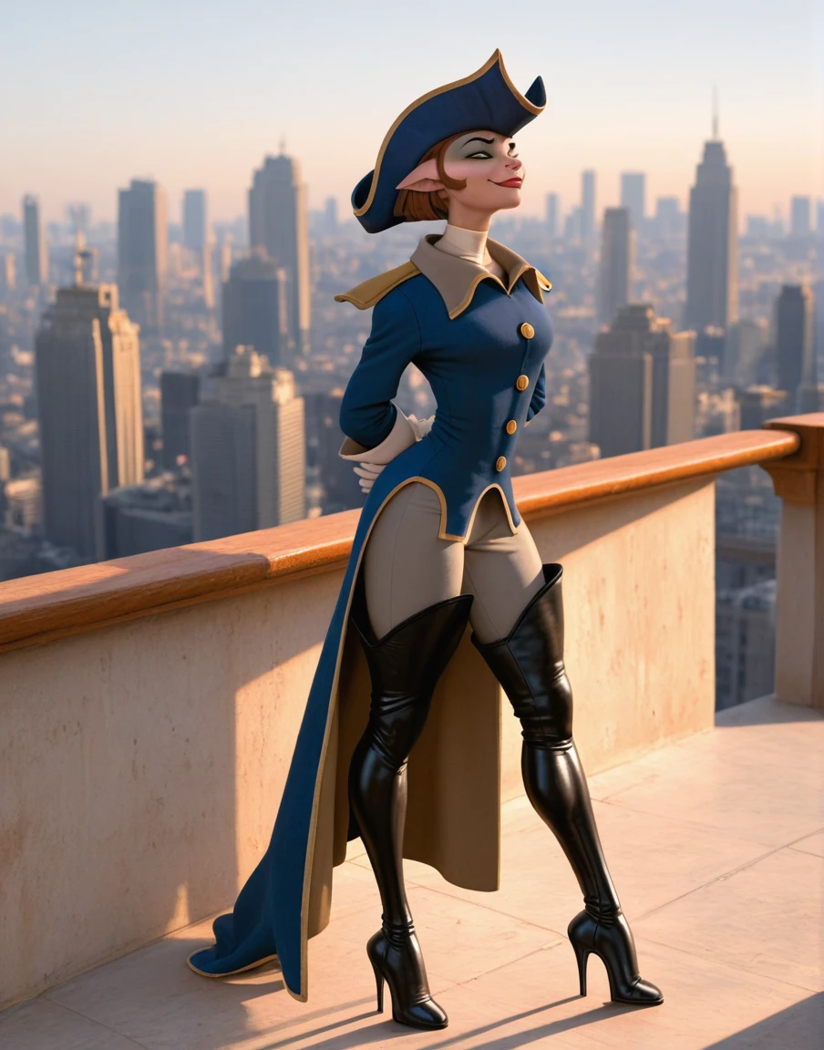 blue coat, white gloves, grey pants, thigh boots, high heels