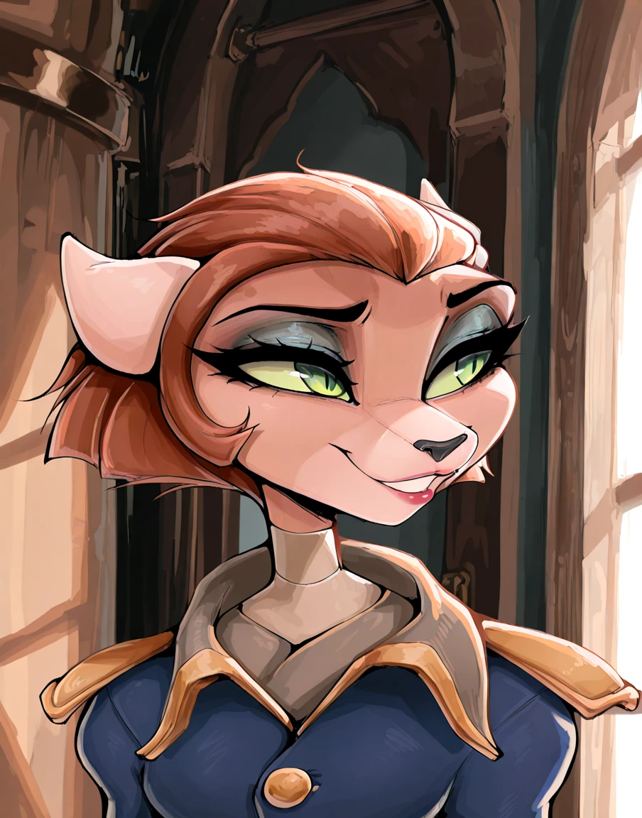 captain amelia, female, green eyes, makeup