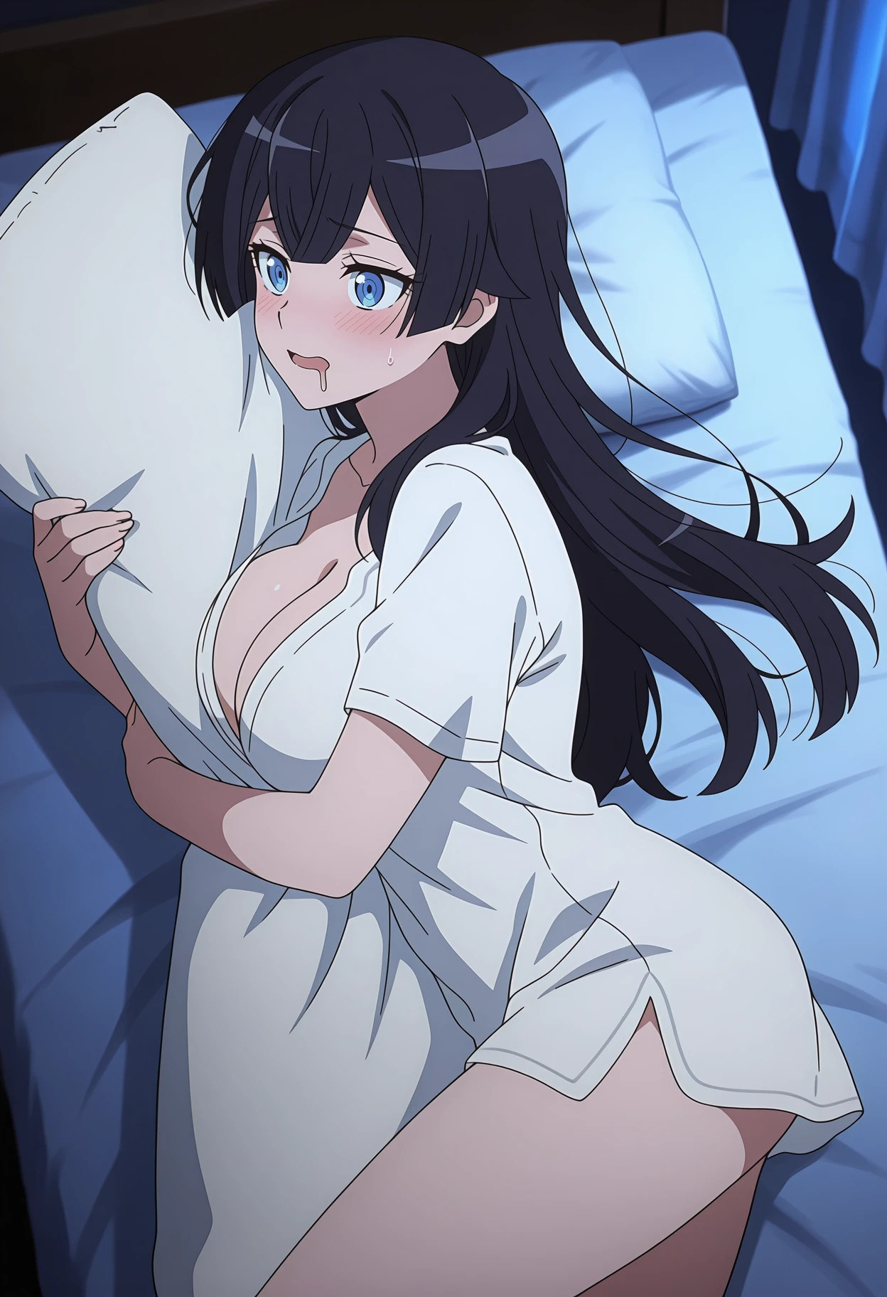 ponytail, double-parted bangs, long hair, black hair, blue eyes, hair bow, blue bow, maid headdress, maid apron, white collar, blue bowtie, blue brooch, cleavage cutout, large breasts, black dress, puffy short sleeves, white gloves, dress bow, black bow, short dress, white skirt, white thighhighs
