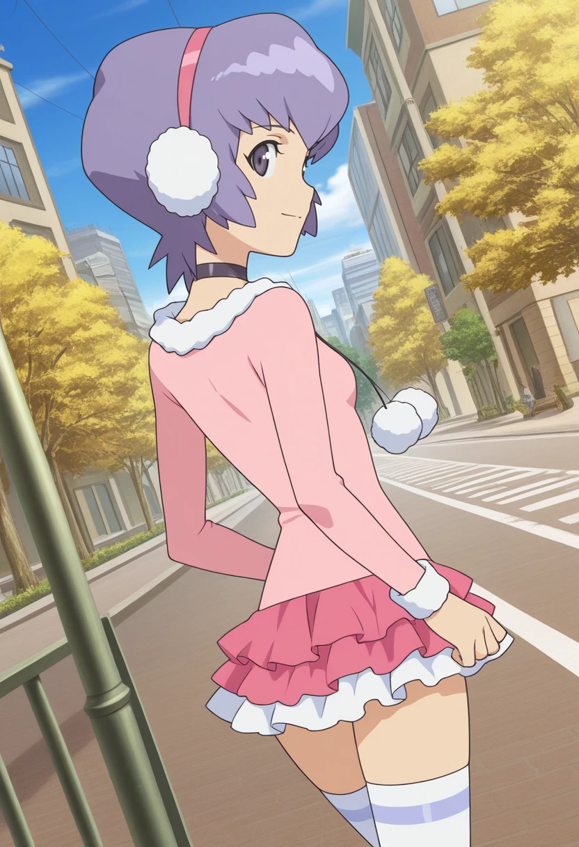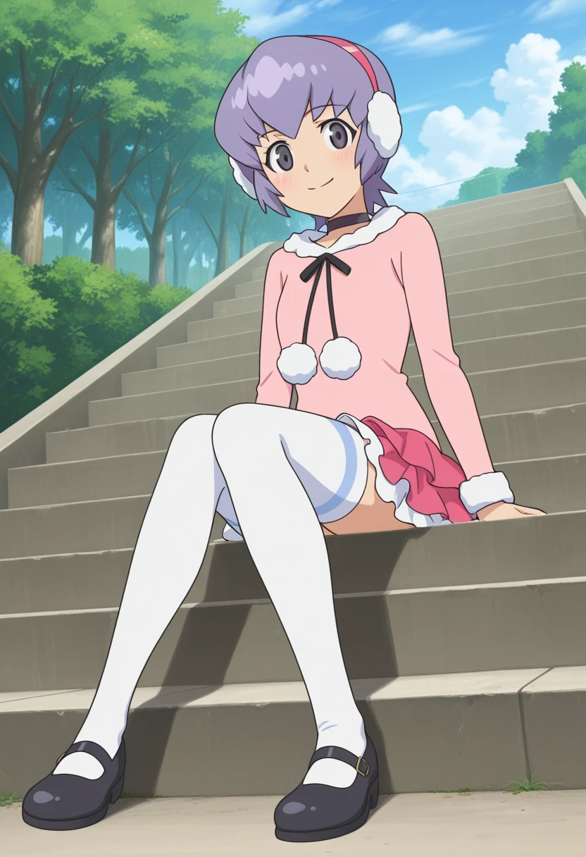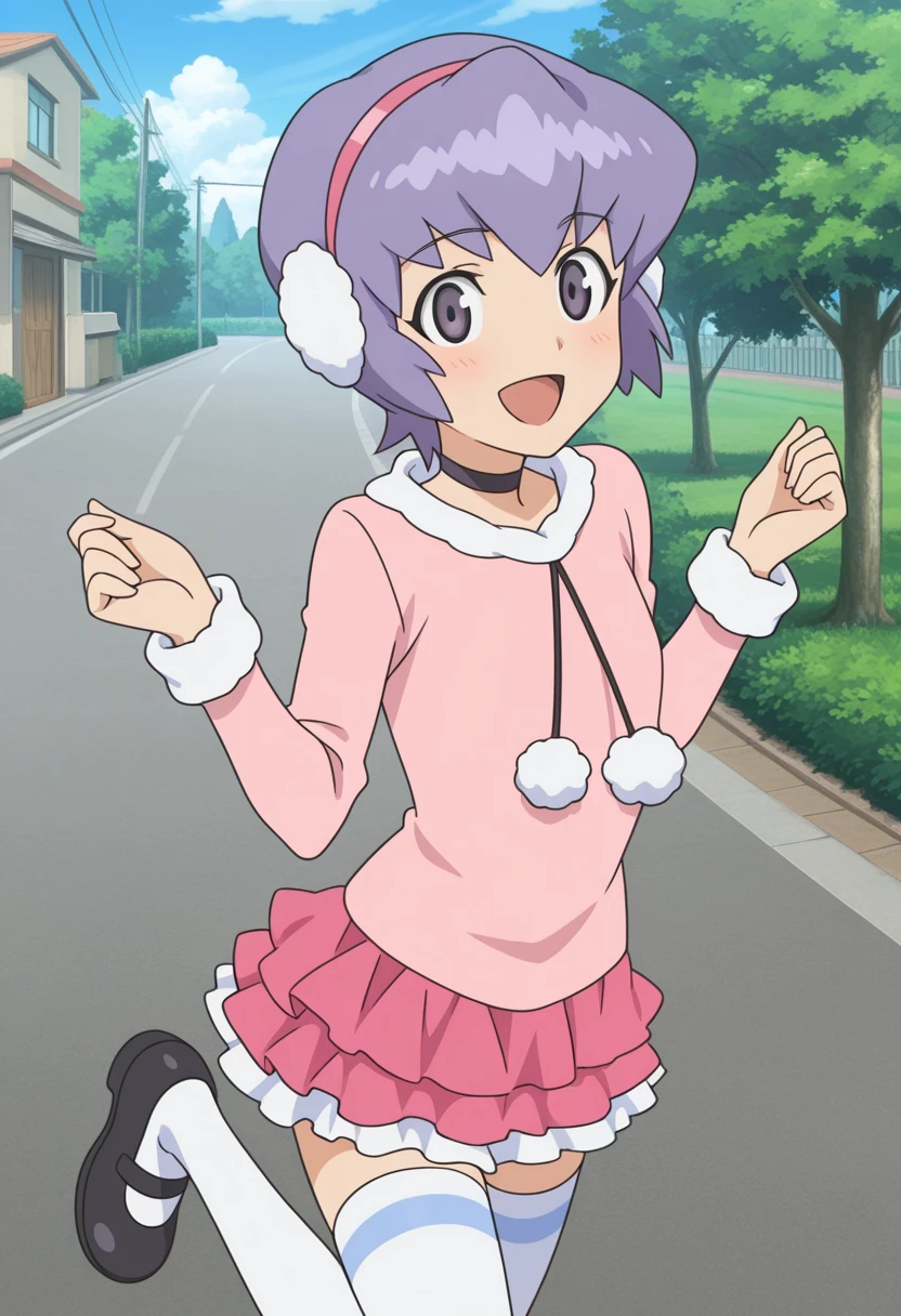 kawamura ami, danball senki, earmuffs, purple hair, short hair, purple eyes, pink shirt, long sleeves, fur trim, pom pom \(clothes\), pink skirt, layered skirt, miniskirt, white thighhighs, mary janes, black footwear,