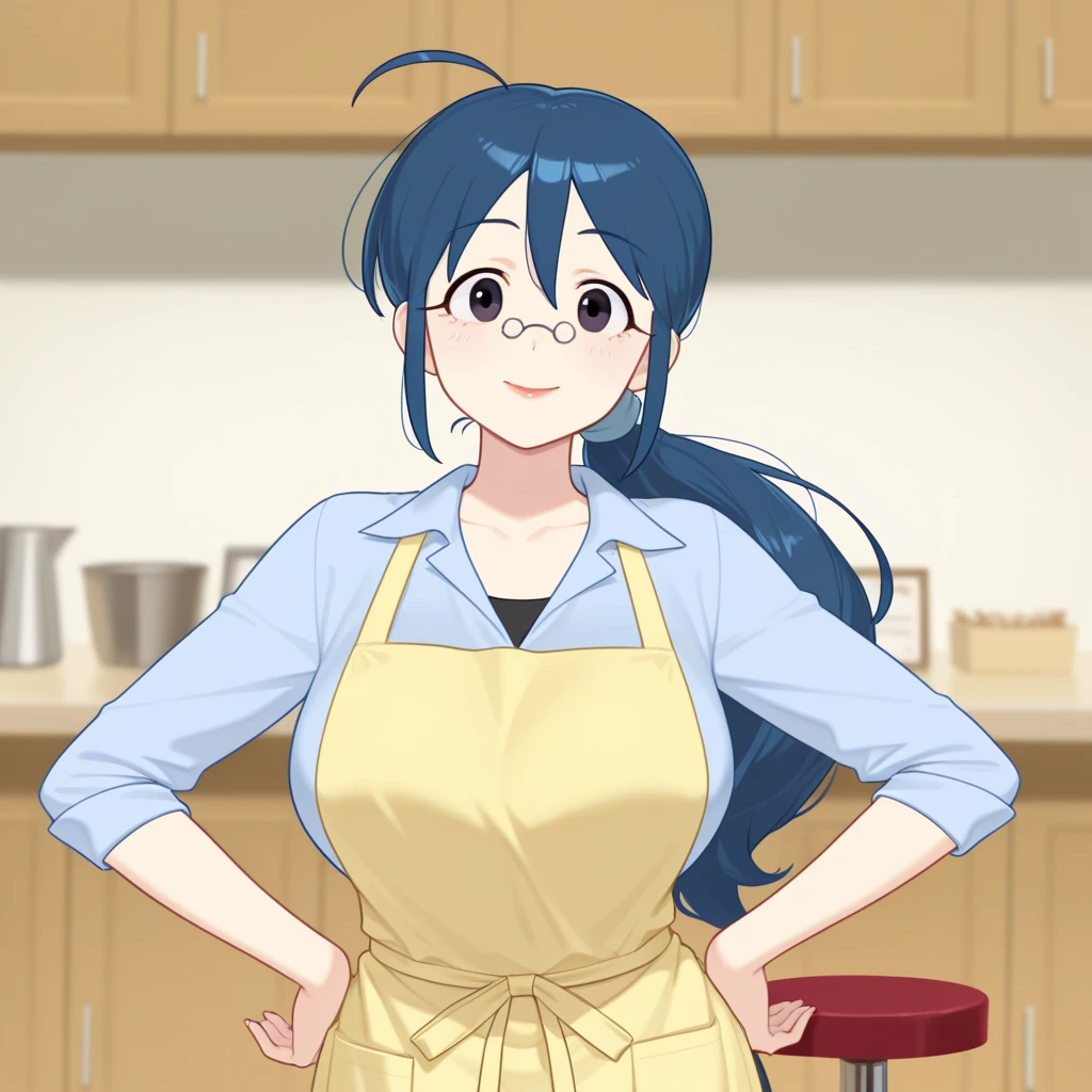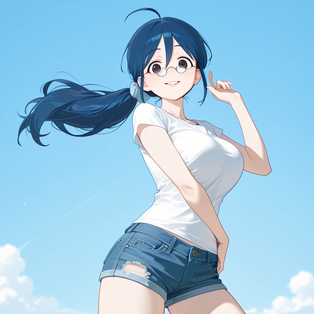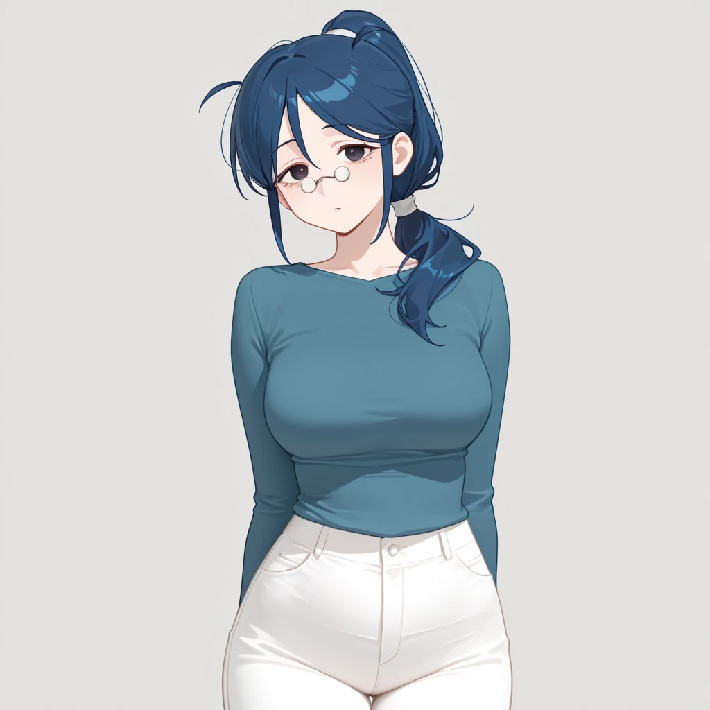 long hair, ponytail, blue hair, ahoge, dark eyes, small glasses,