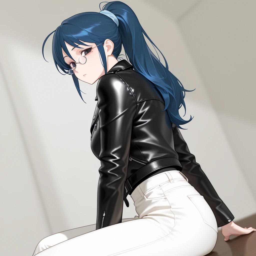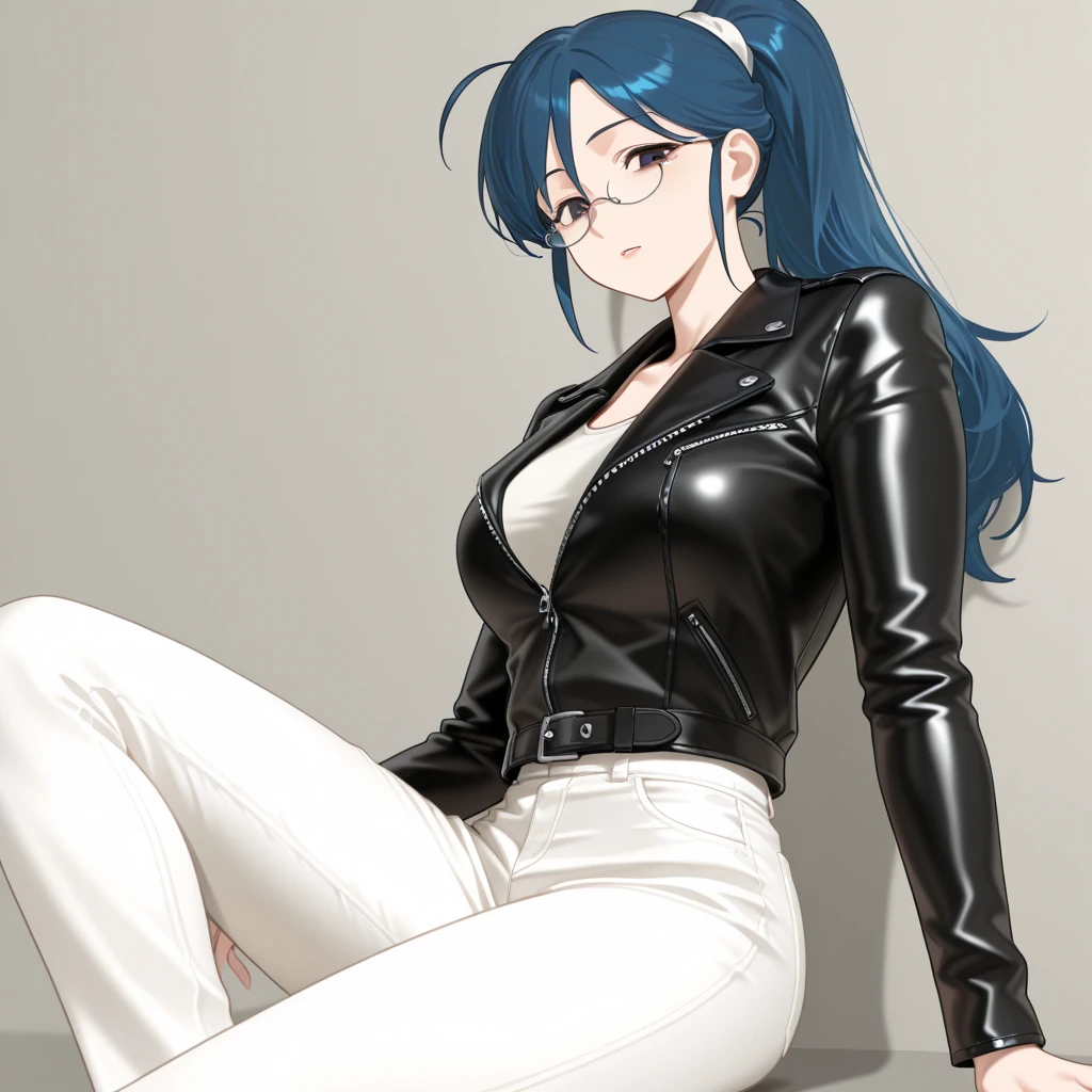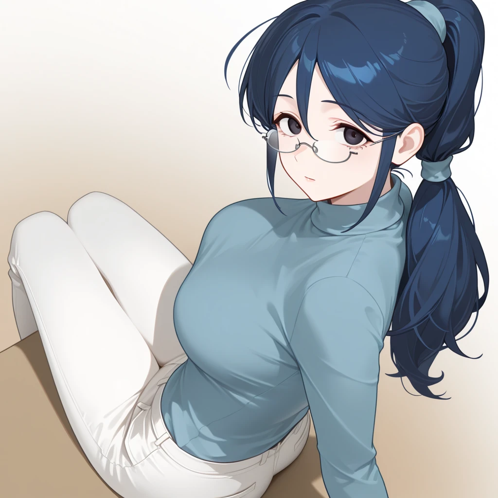 long hair, ponytail, blue hair, ahoge, dark eyes, small glasses,