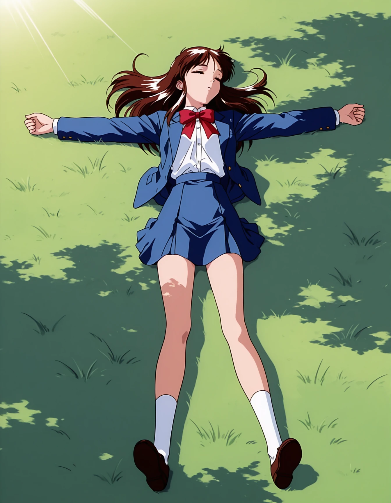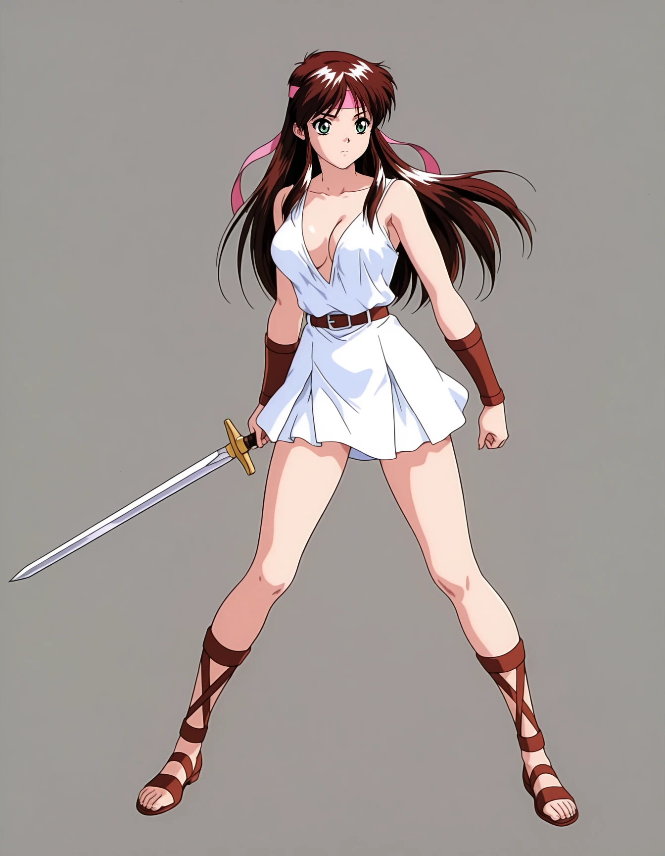 mai_sw-maya,long_hair,retro_artstyle,1980s_(style),brown_hair,green_eyes,sidelocks,medium_breasts,cleavage,white_dress,short_skirt,roman_shoes,pink_headband,holding_swordschool_uniform,long_sleeves,blue_jacket,red_bow,skirtRecommend preferred Strength: 0.7~1.
