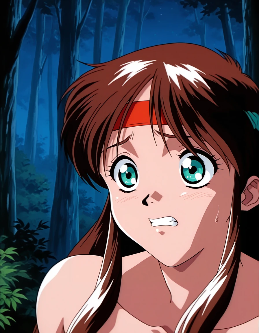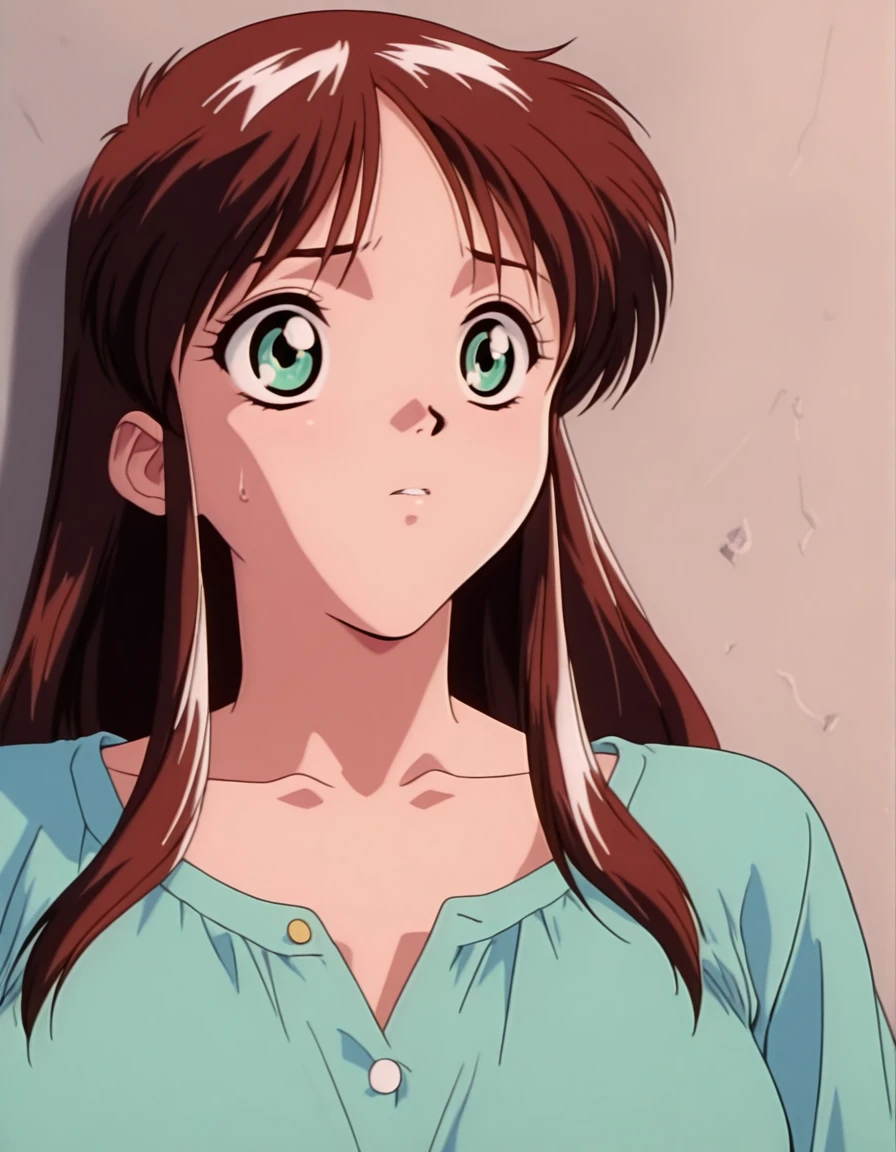 mai_sw-maya,long_hair,retro_artstyle,1980s_(style),brown_hair,green_eyes,sidelocks,medium_breasts
