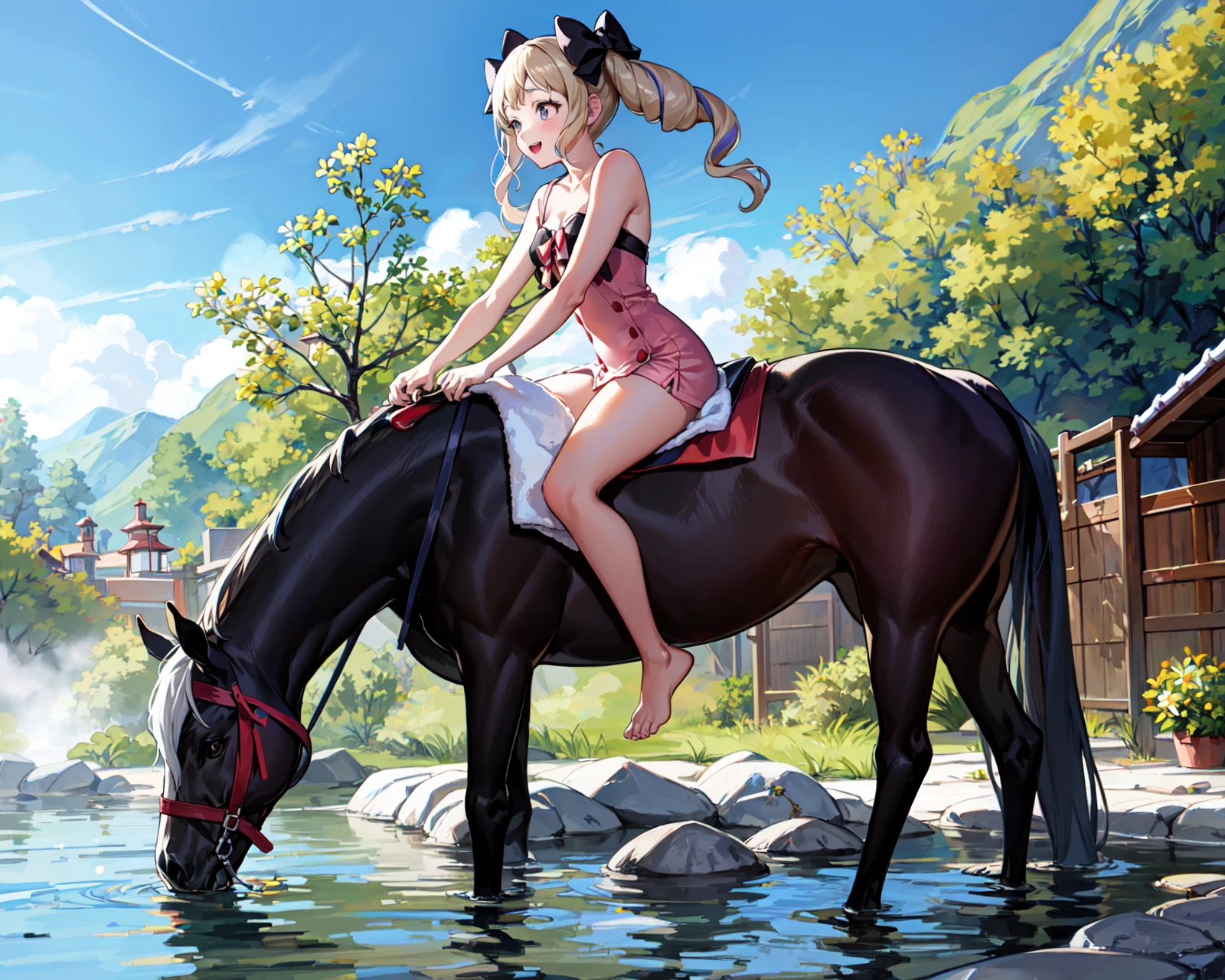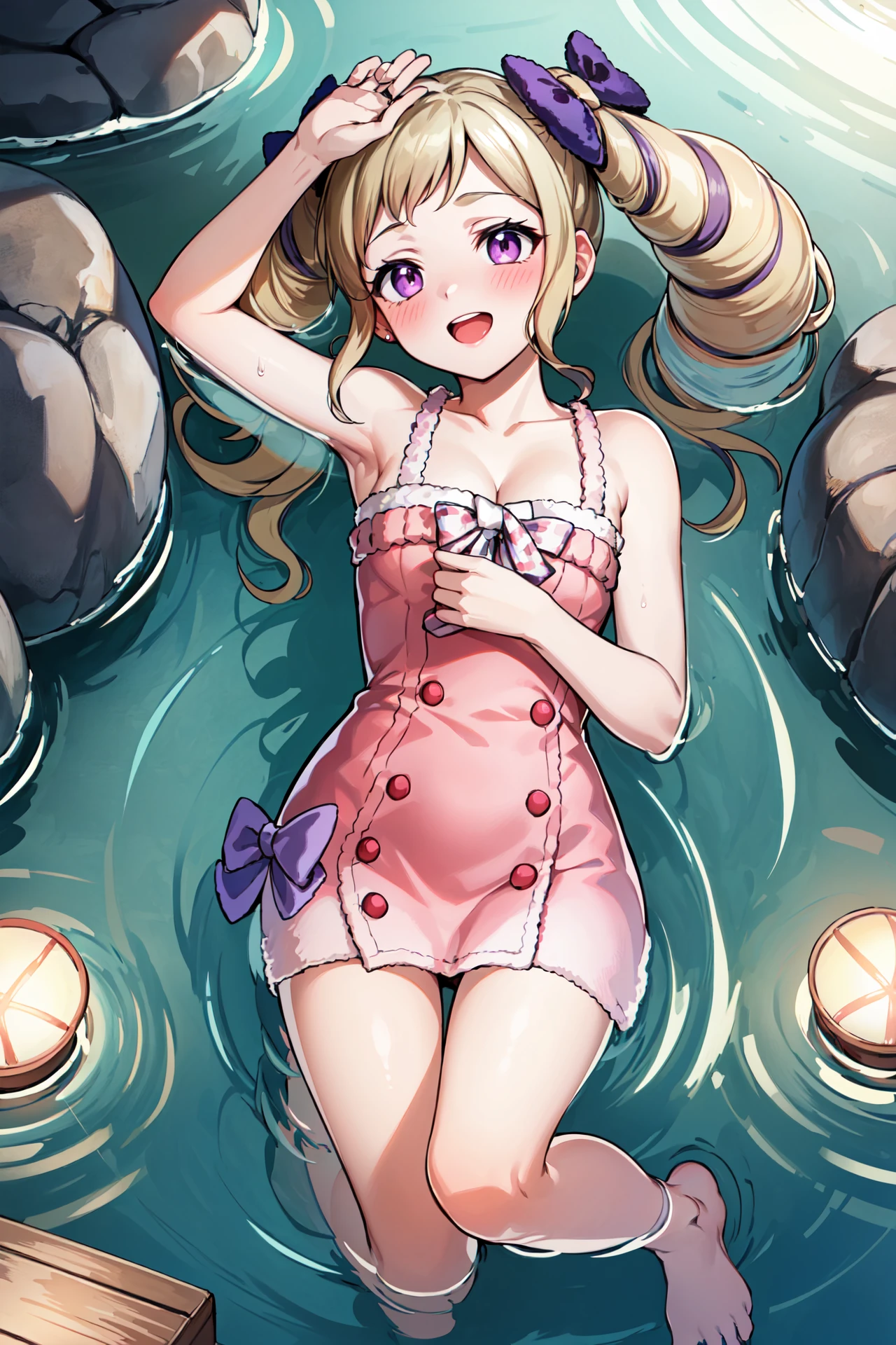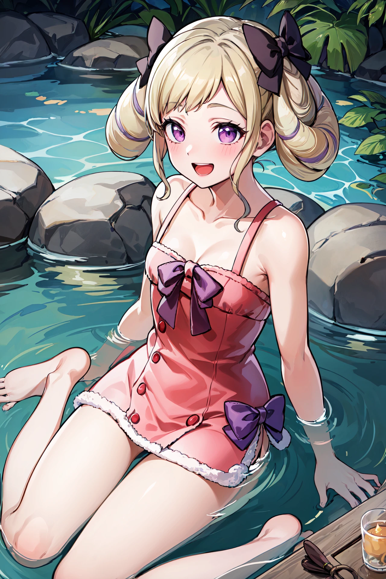 【Hoshidan Summer outfit】:hos_elise, barefoot, small breasts, bow, short dress, cleavage, buttons, towel,