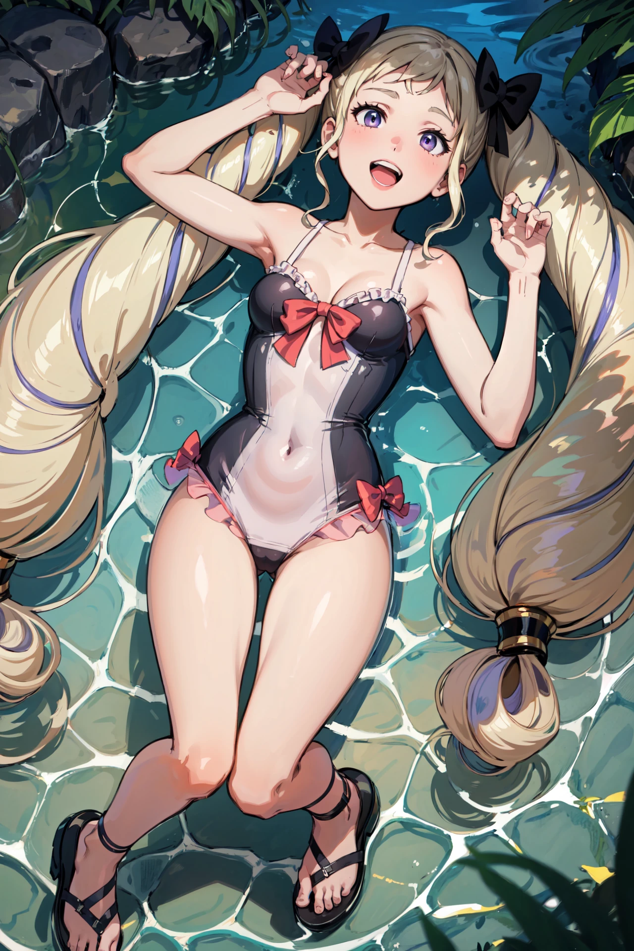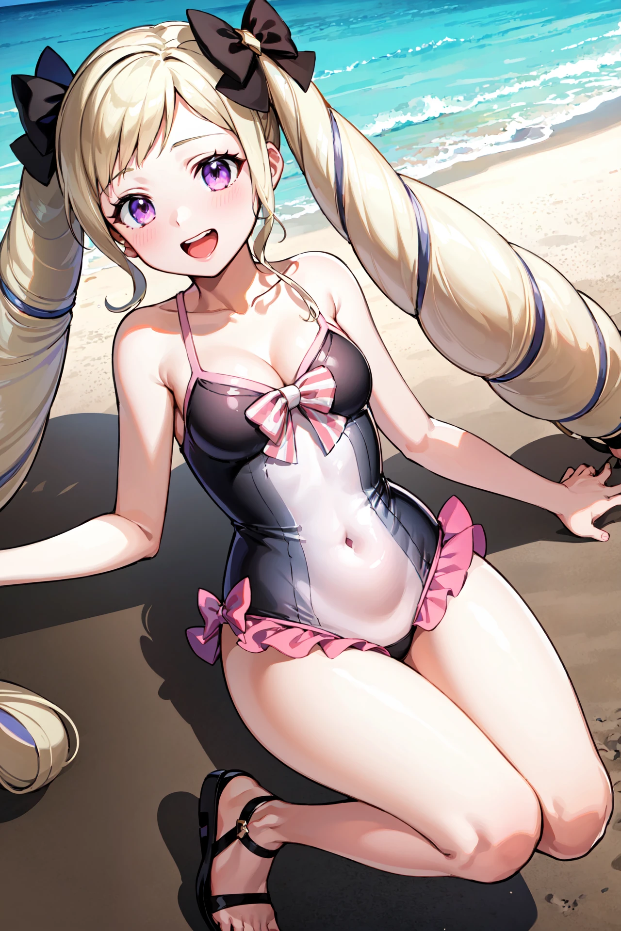【Summer outfit】: sum_elise, swimsuit, bow, covered navel, black sandals, bare shoulders, cleavage, frills, see-through, striped,