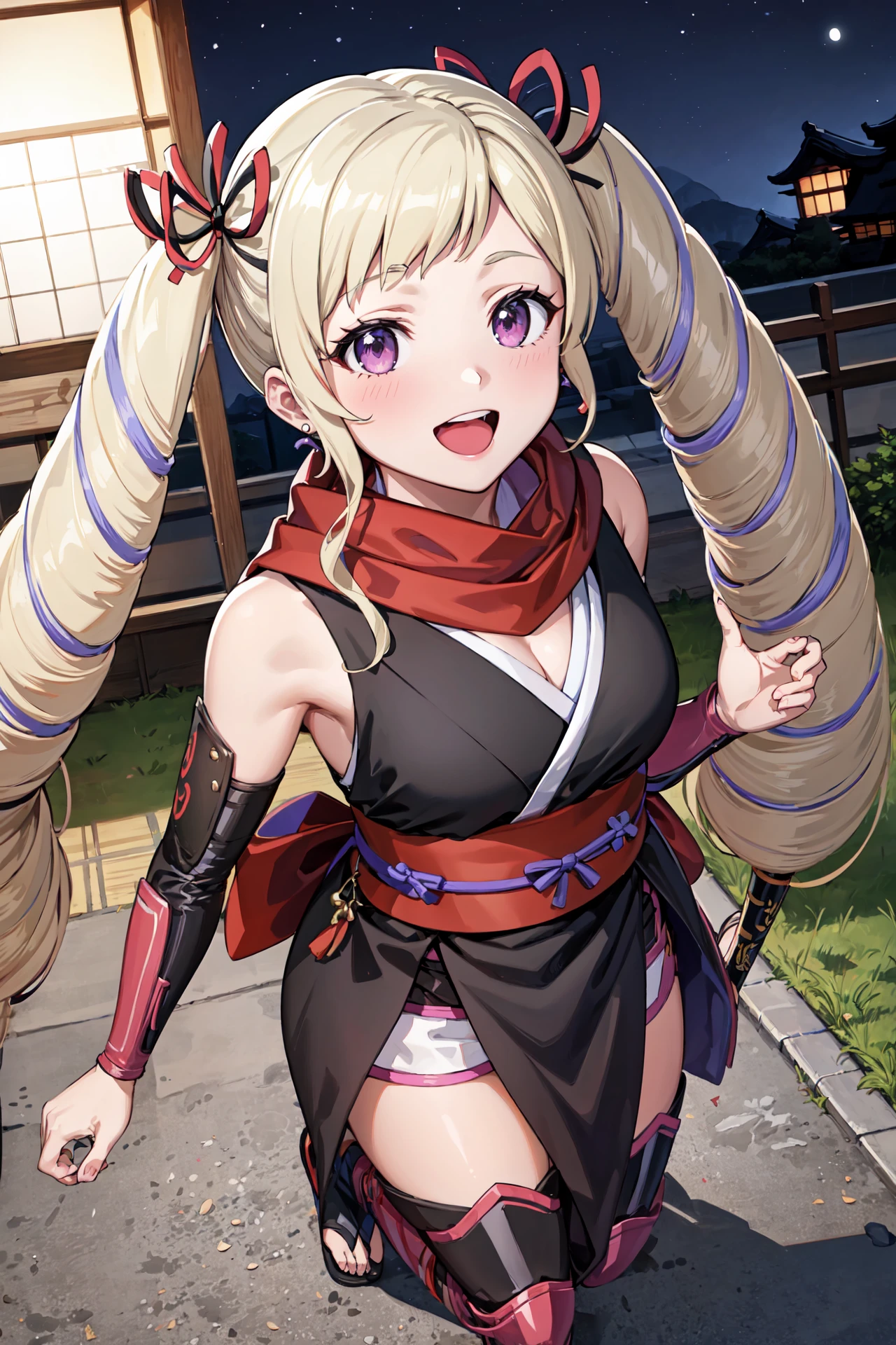 【Ninja outfit】: nin_elise, twintails, black japanese clothes, earrings, sash, bare shoulders, pelvic curtain, thigh guards, red obi, ribbon, red scarf, arm guards, cleavage, thigh strap, thighs, black short kimono, toeless footwear, zouri,