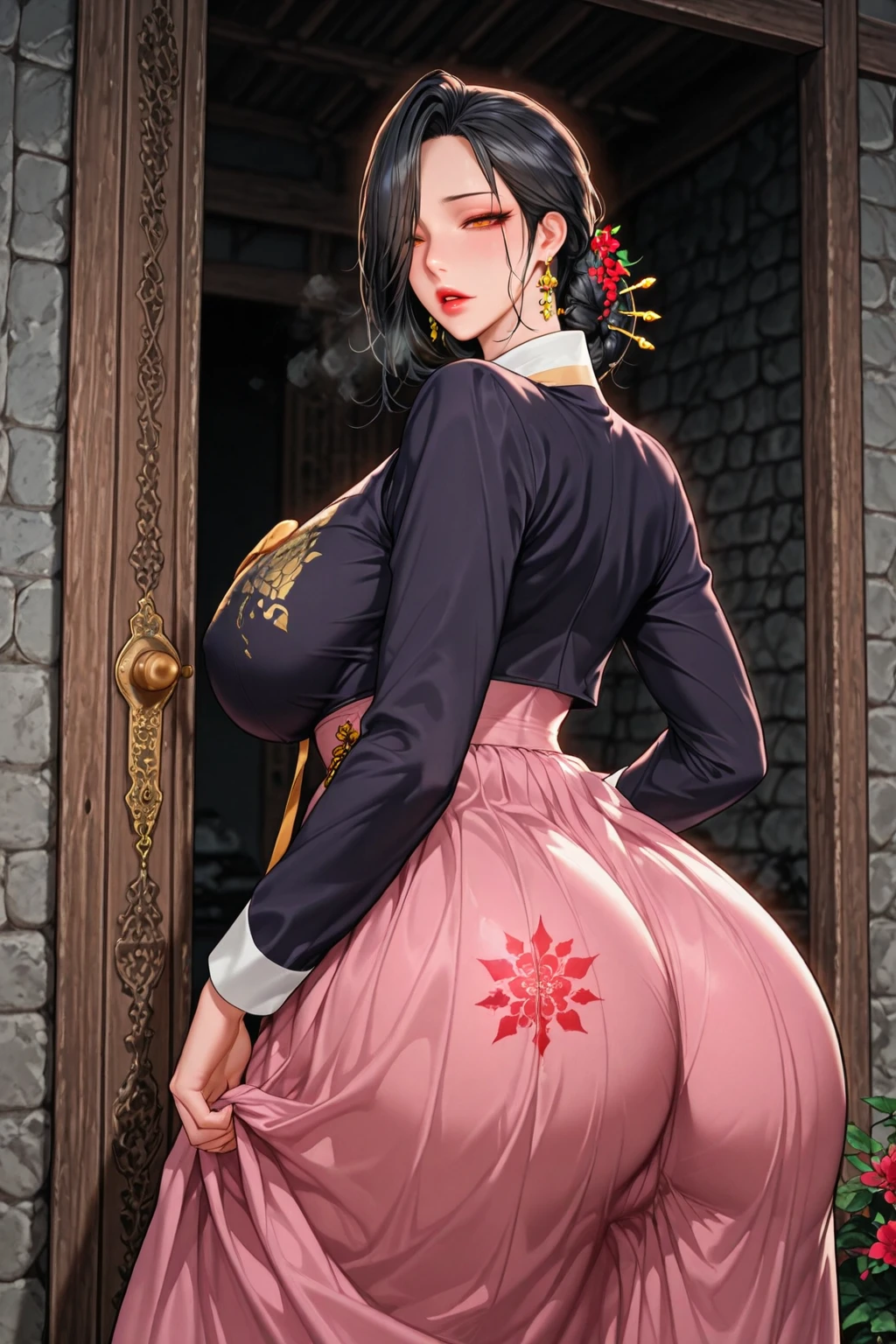 1girl, solo, jiwok, tucked hair, tucked hair, updo, low bun, hair gathered at nape, side parted hair, long side bangs, black hair, slightly wavy hair, long bangs, parted bangs, hair over one eye, golden hairpin, hair strands, hair strands over eyes, long eyelashes, orange eyes, red_lips, golden earrings, hair ornament, red lipstick,