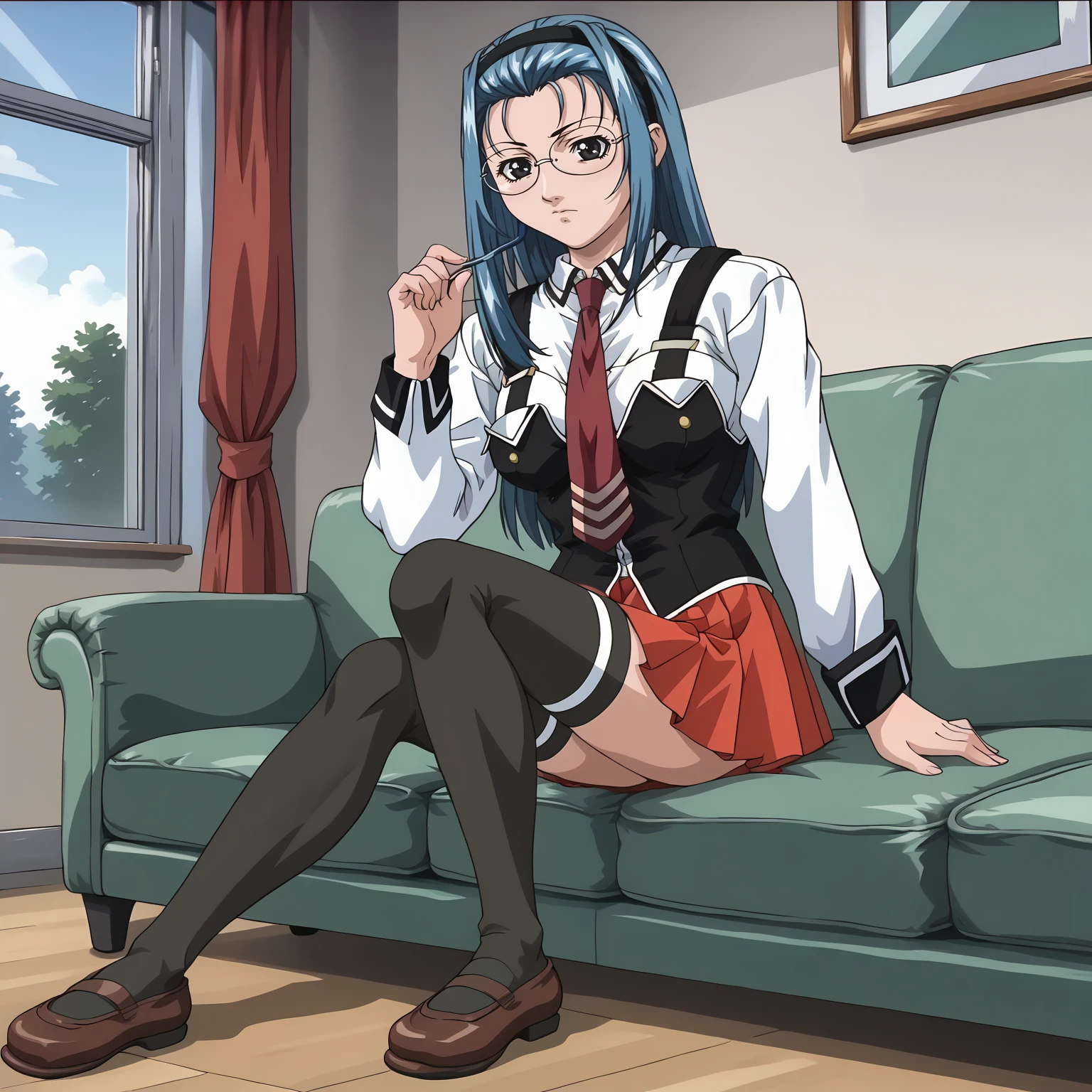 JunkoMochida,1girl,blue hair,hair band,black eyes,eyewear,