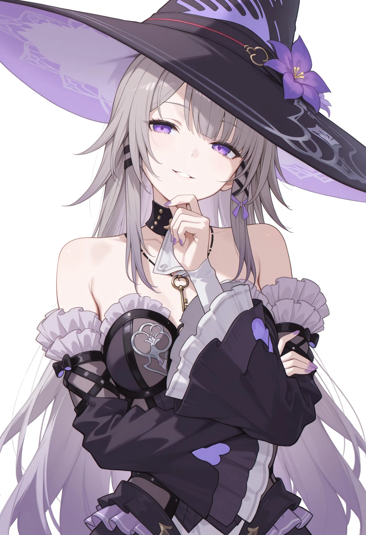 h3rta (base), witch hat, purple flower, ascot, necklace, bare shoulders, witch hat, black headwear, strapless dress, frills, long sleeves, wide sleeves, detached skirt, pantyhose, thigh strap, asymmetrical legwear, high heels boots