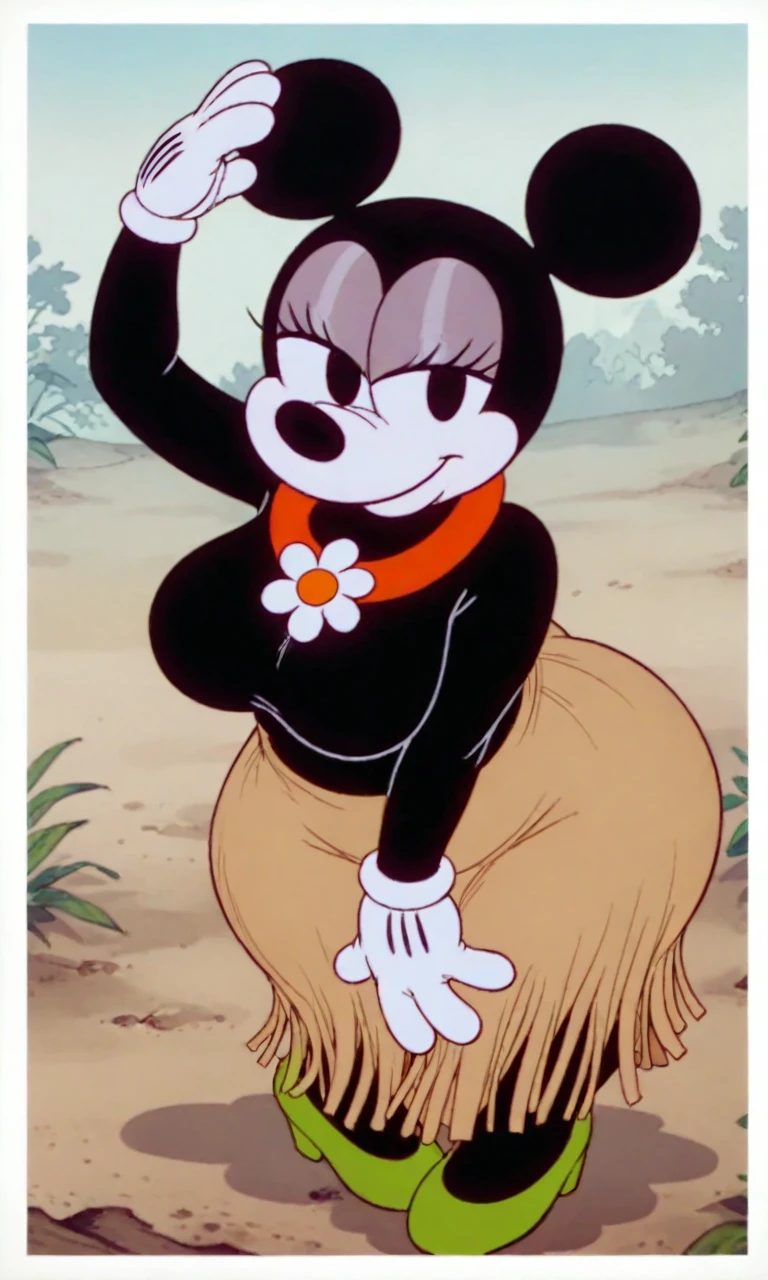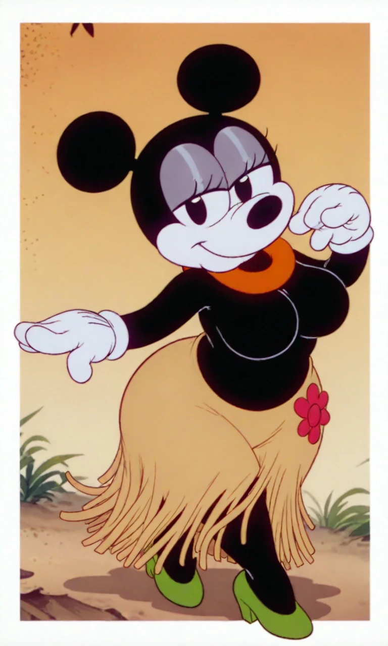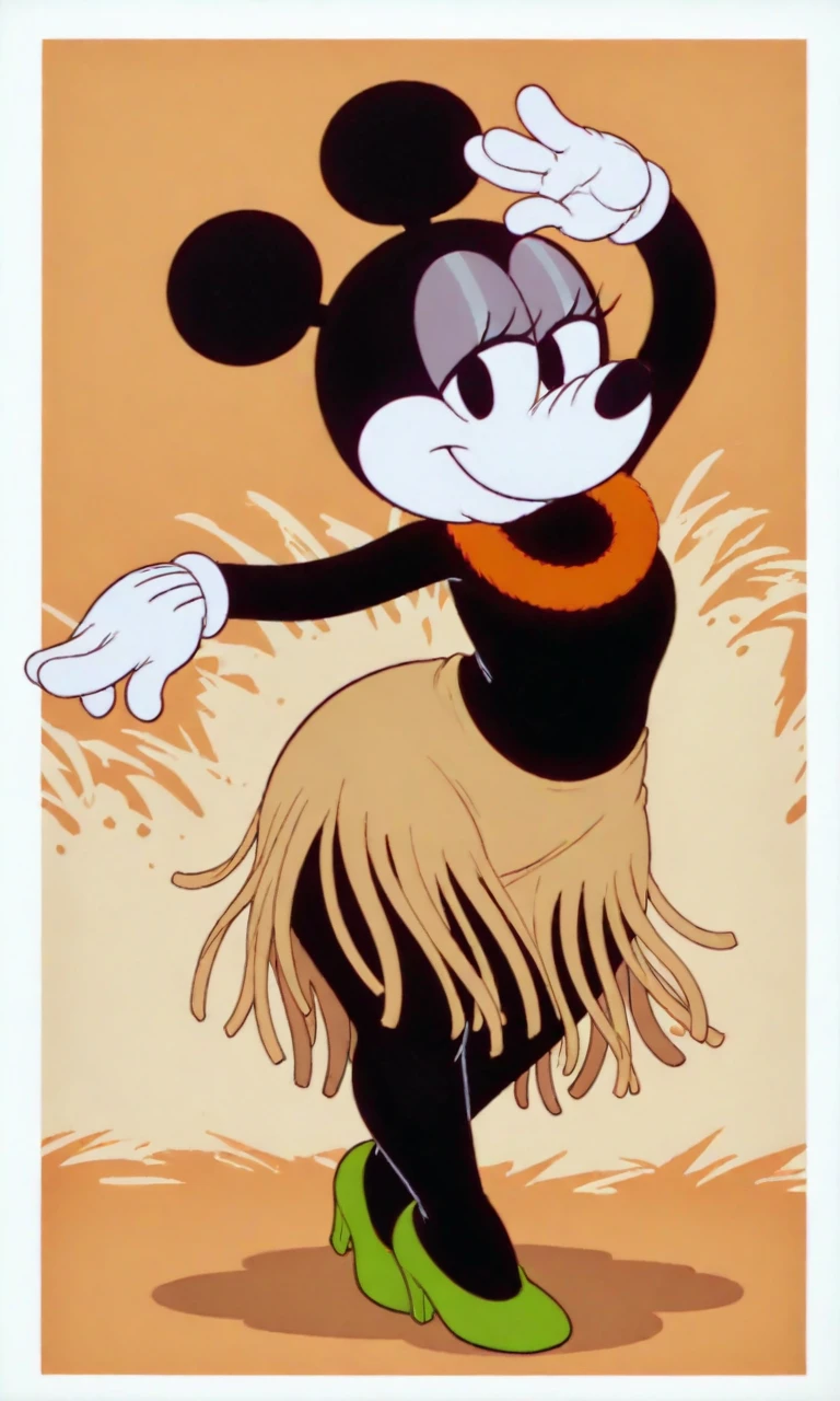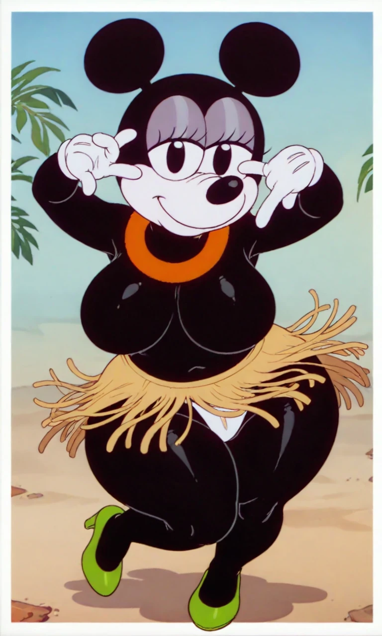Tags: hawai_minnie, black eyes, black ear, black body, white face, black torso, white gloves, green heels, grass skirt, red floral collar neck