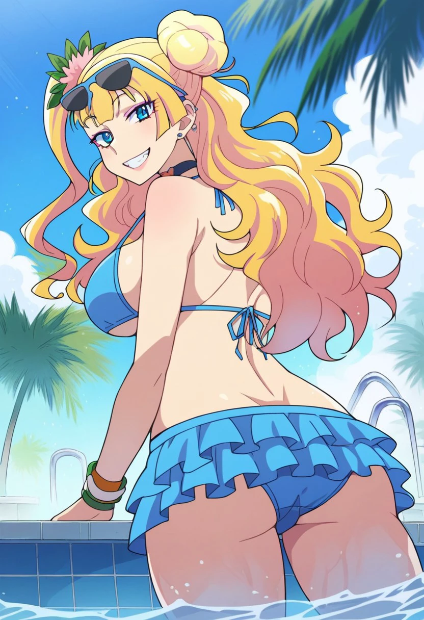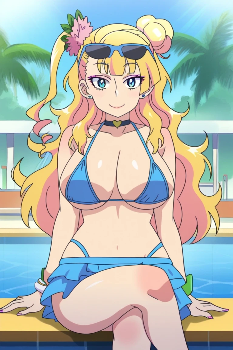 sunglasses, eyewear on head, choker, swimsuit, blue bikini, bikini skirt