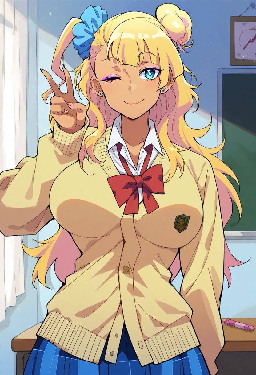 g4lk0, blonde hair, long hair, asymmetrical hair, scrunchie, one side up, hair bun, blue eyes, makeup, stud earrings