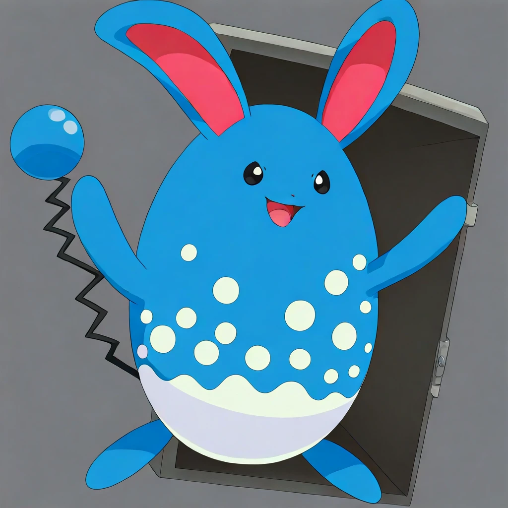 azumarill, pokemon (creature), blue skin, bipedal, white bottom half, six white circles on belly, black eyes, one black tail, one blue sphere attached to tail, no fingers, no toes