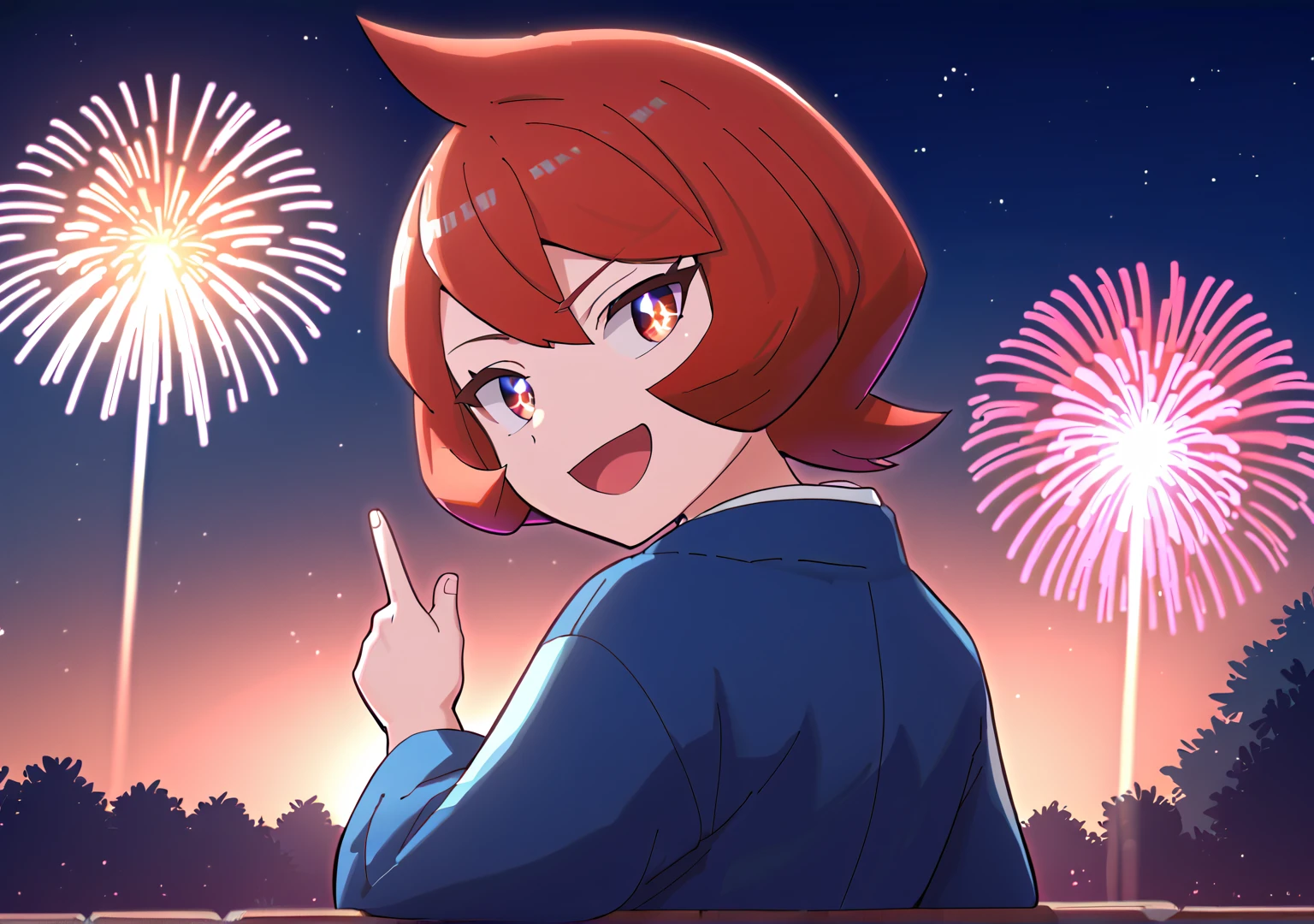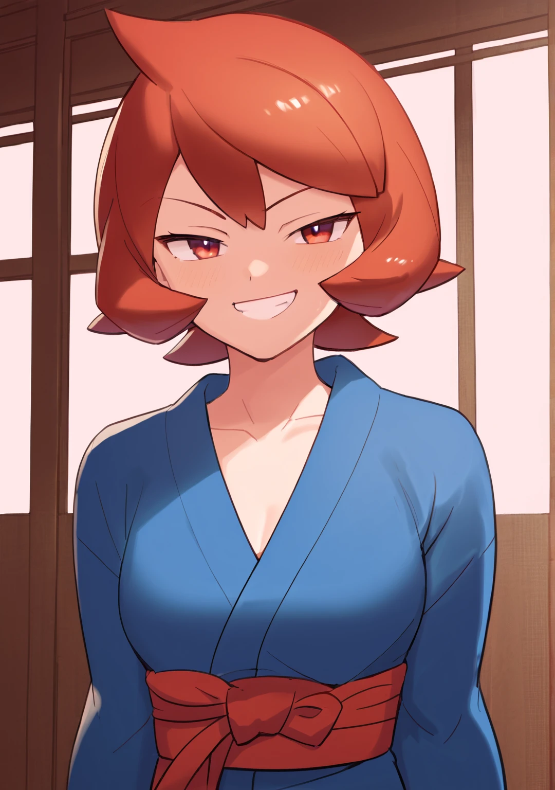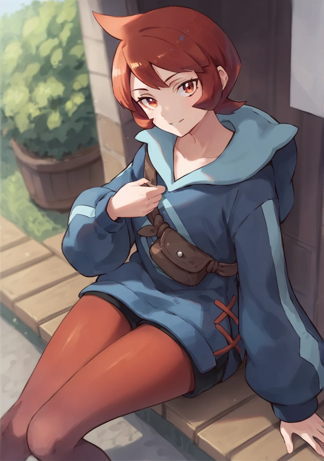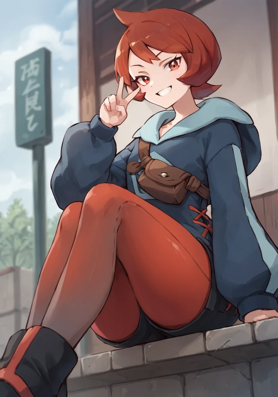1girl, solo, arezu_(pokemon), short_hair, red_hair, red_eyes, cowlick, diamond clan outfit, blue hoodie, red pantyhose, brown bag, Description