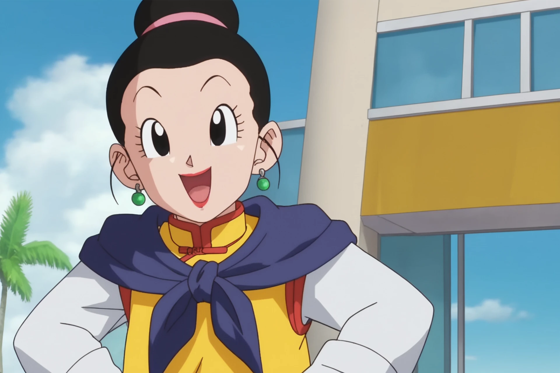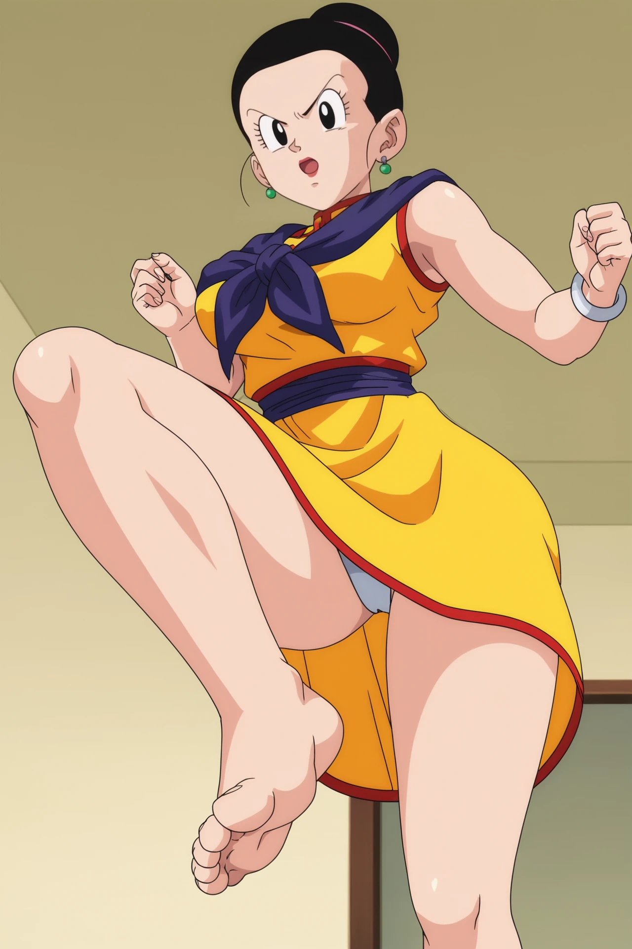 chi-chi, hair pulled back, black hair, single hair bun, black eyes,