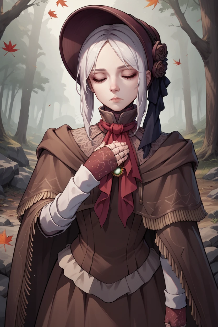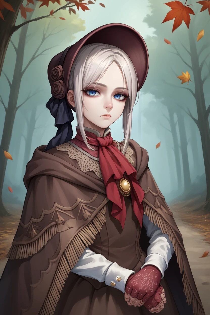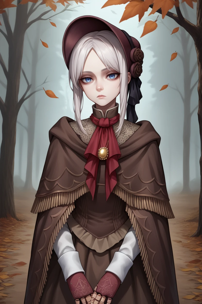 bonnet, red ascot, brown cloak, brown dress, long dress, gloves