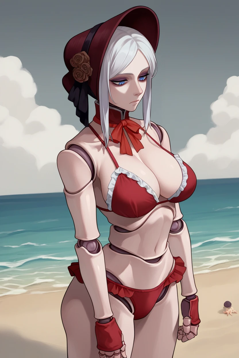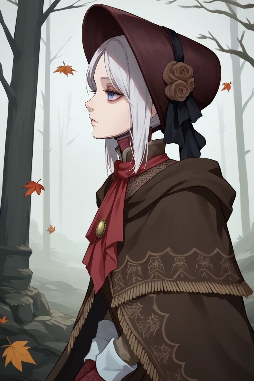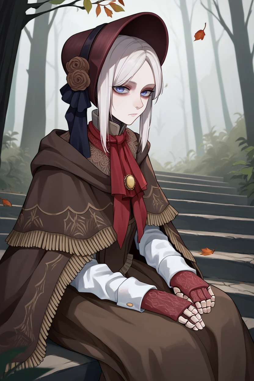 Add "bonnet, red ascot, brown cloak, brown dress, long dress, gloves" for her typical look.