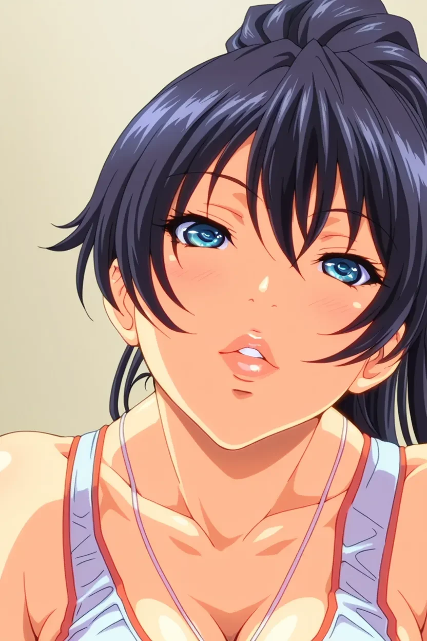 1girl, Sanae (Aneki), long hair, ponytail, black hair, blue eyes, glossy lips, thick lips, HD, 8k, superb quality, high-resolution, clear animation, uncensored