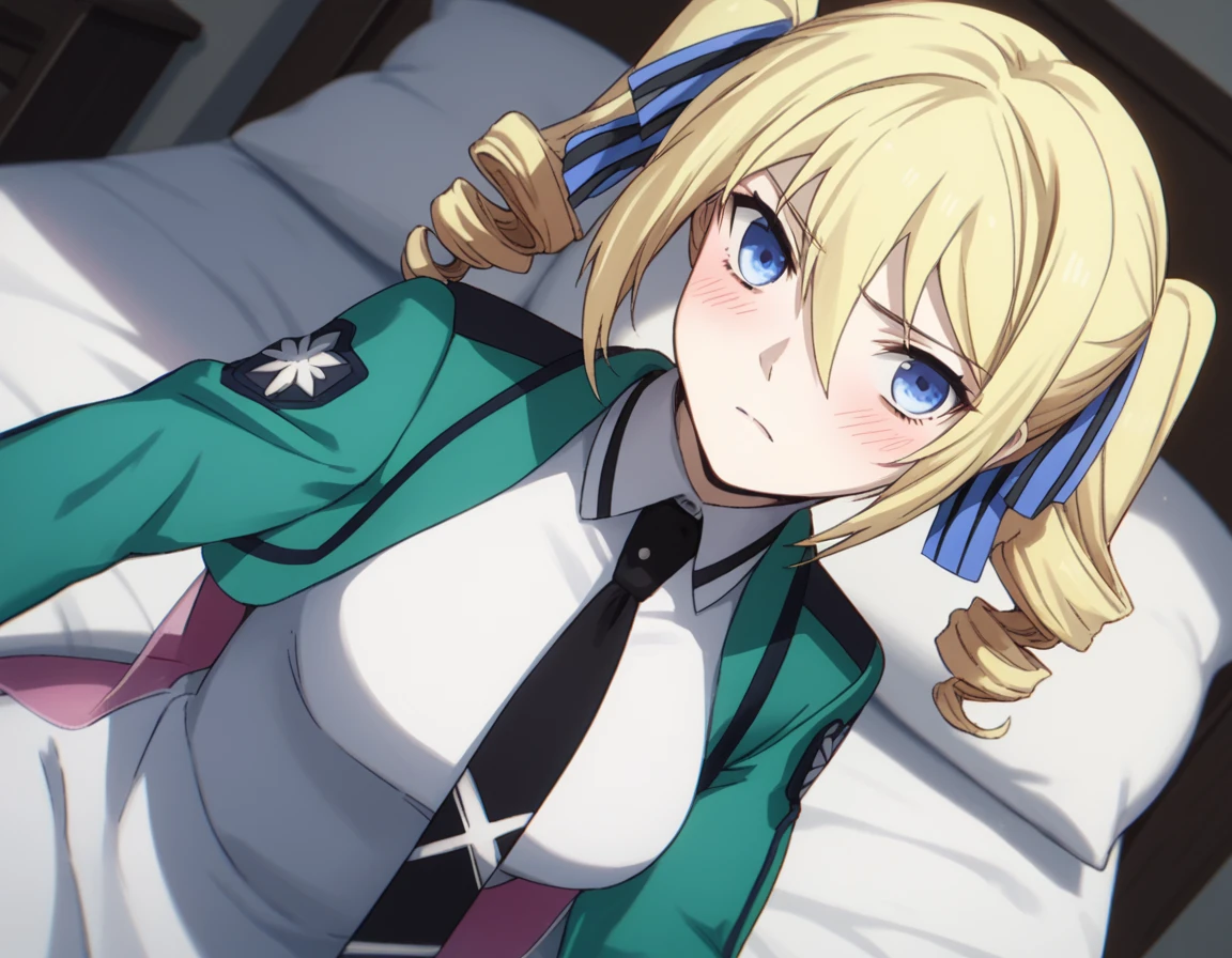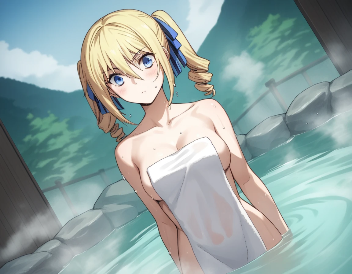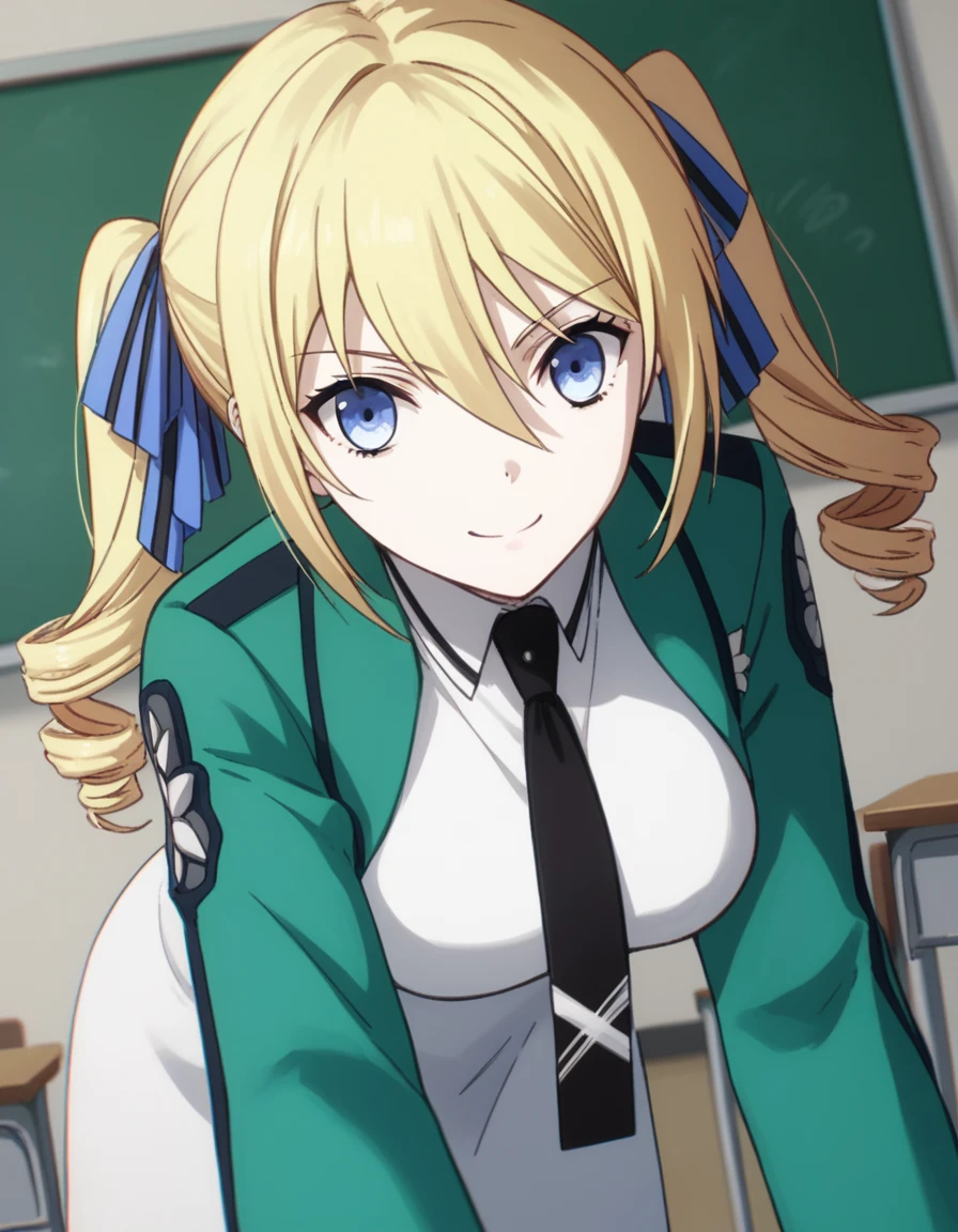 angelina kudou shields, blue eyes, blonde hair, ribbon, hair between eyes, twintails, hair ribbon, drill hair, blue ribbon, twin drills,