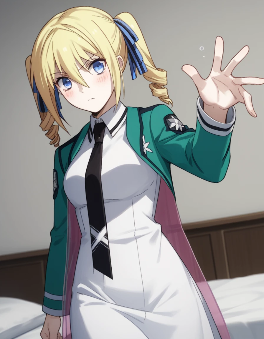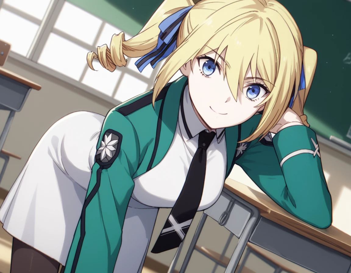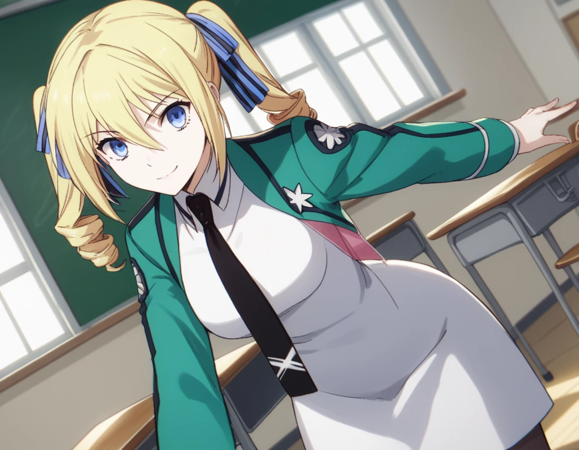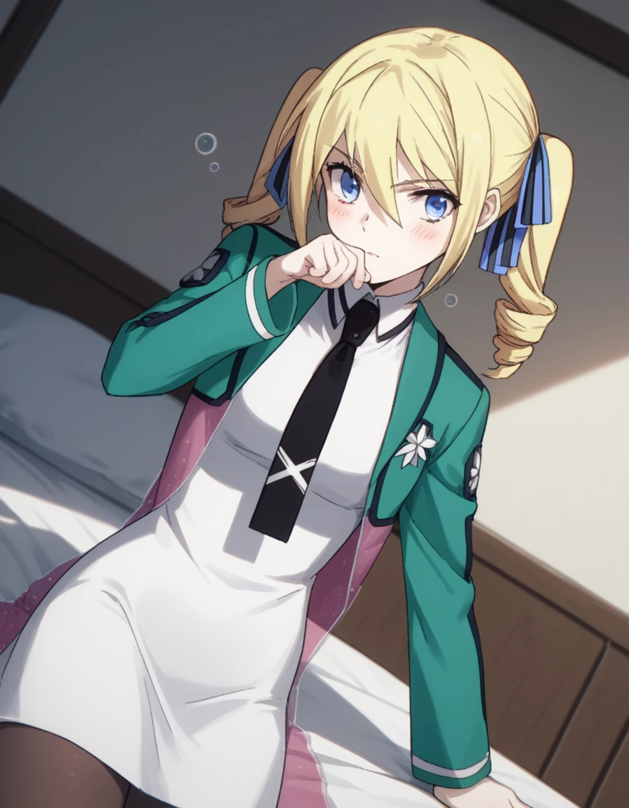 angelina kudou shields, blue eyes, blonde hair, ribbon, hair between eyes, twintails, hair ribbon, drill hair, blue ribbon, twin drills,
