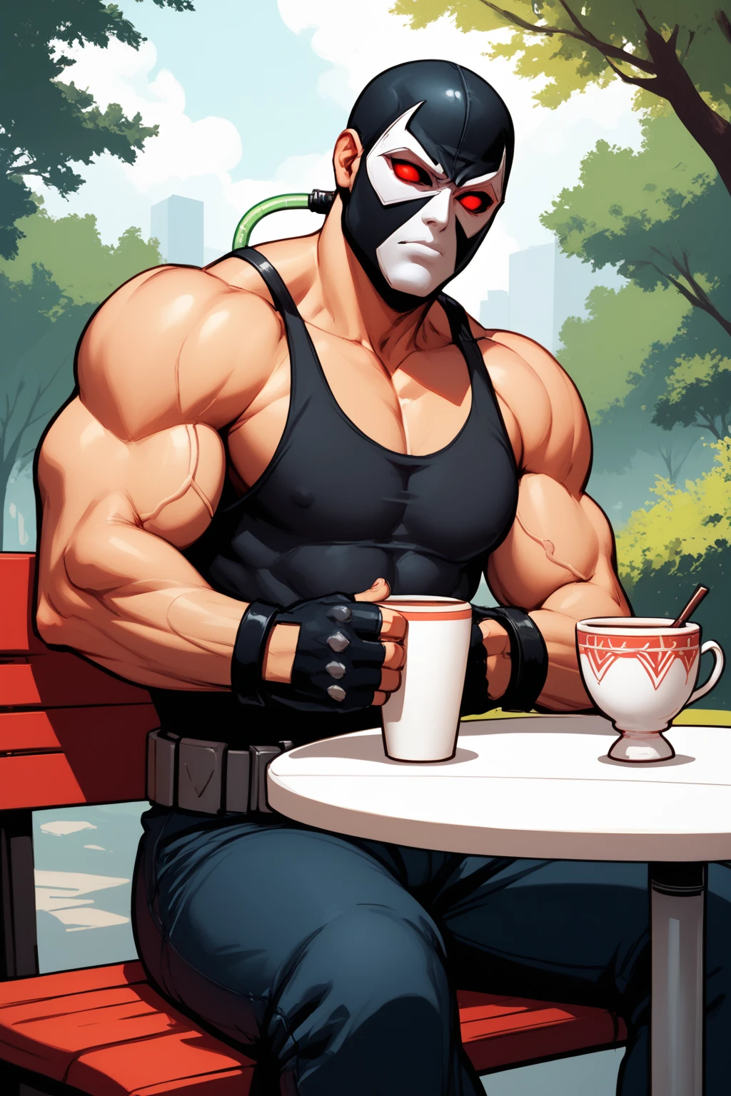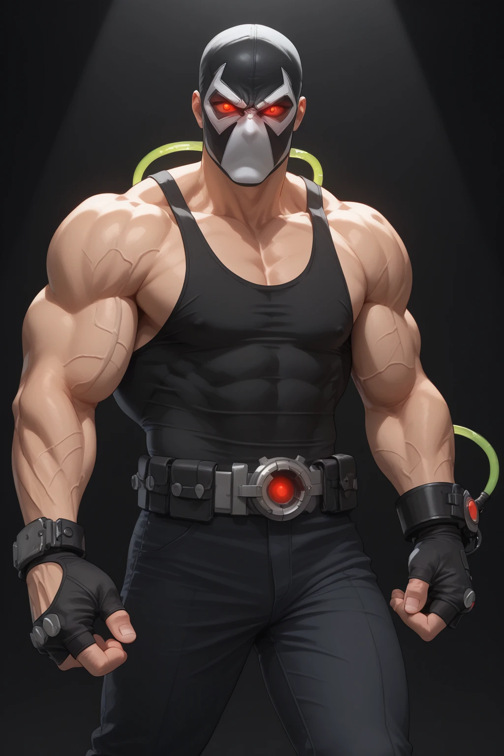 Trigger: black white mask, green thick veins, green glowing tubes on arm and head, extremely large muscular, man, red glowing eyes, gloves, tank, top, pants, boots, armor