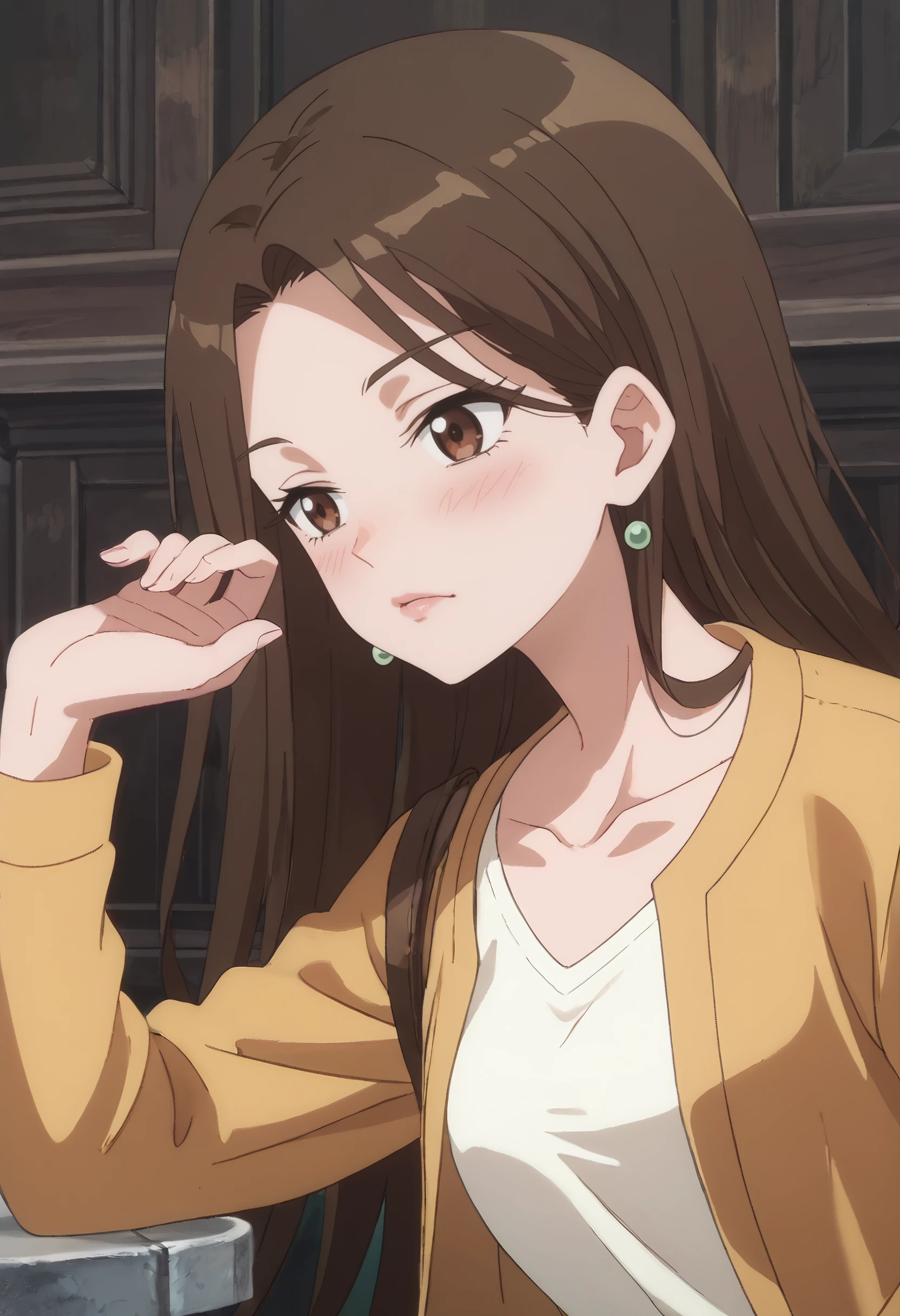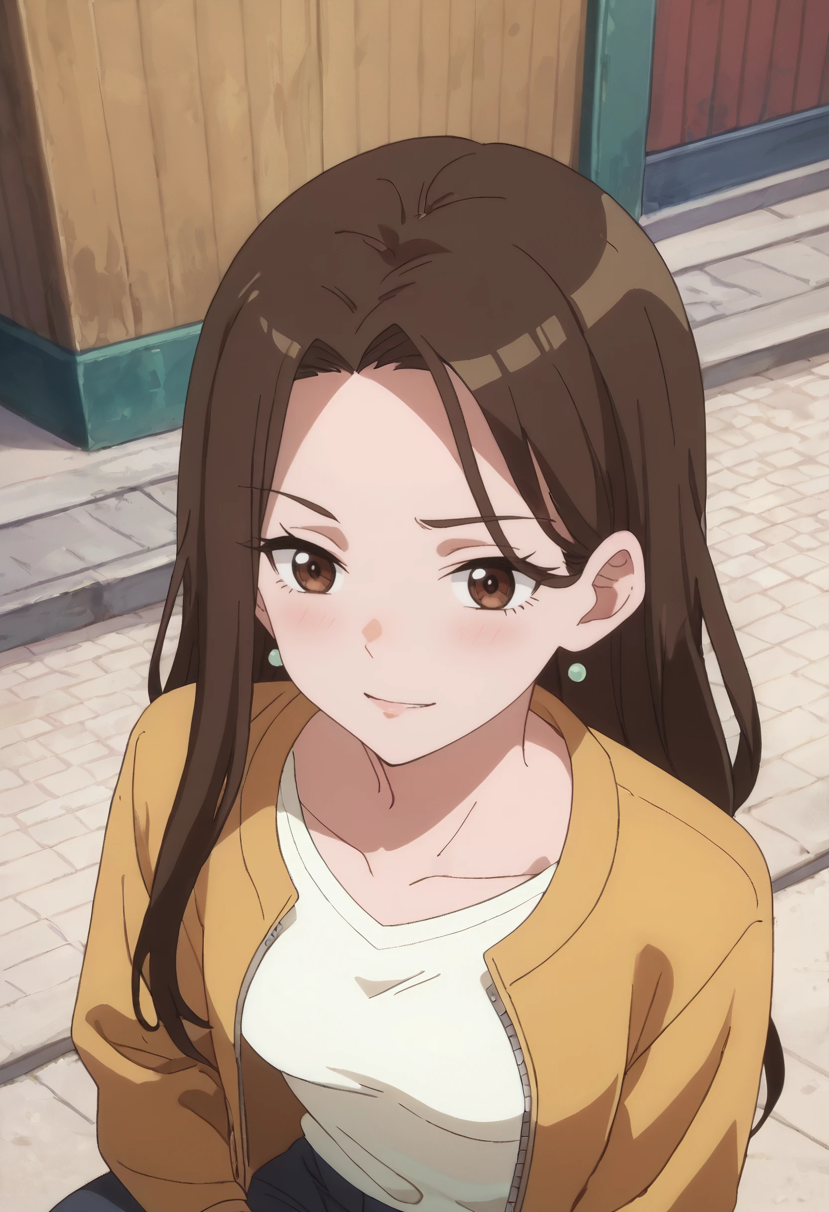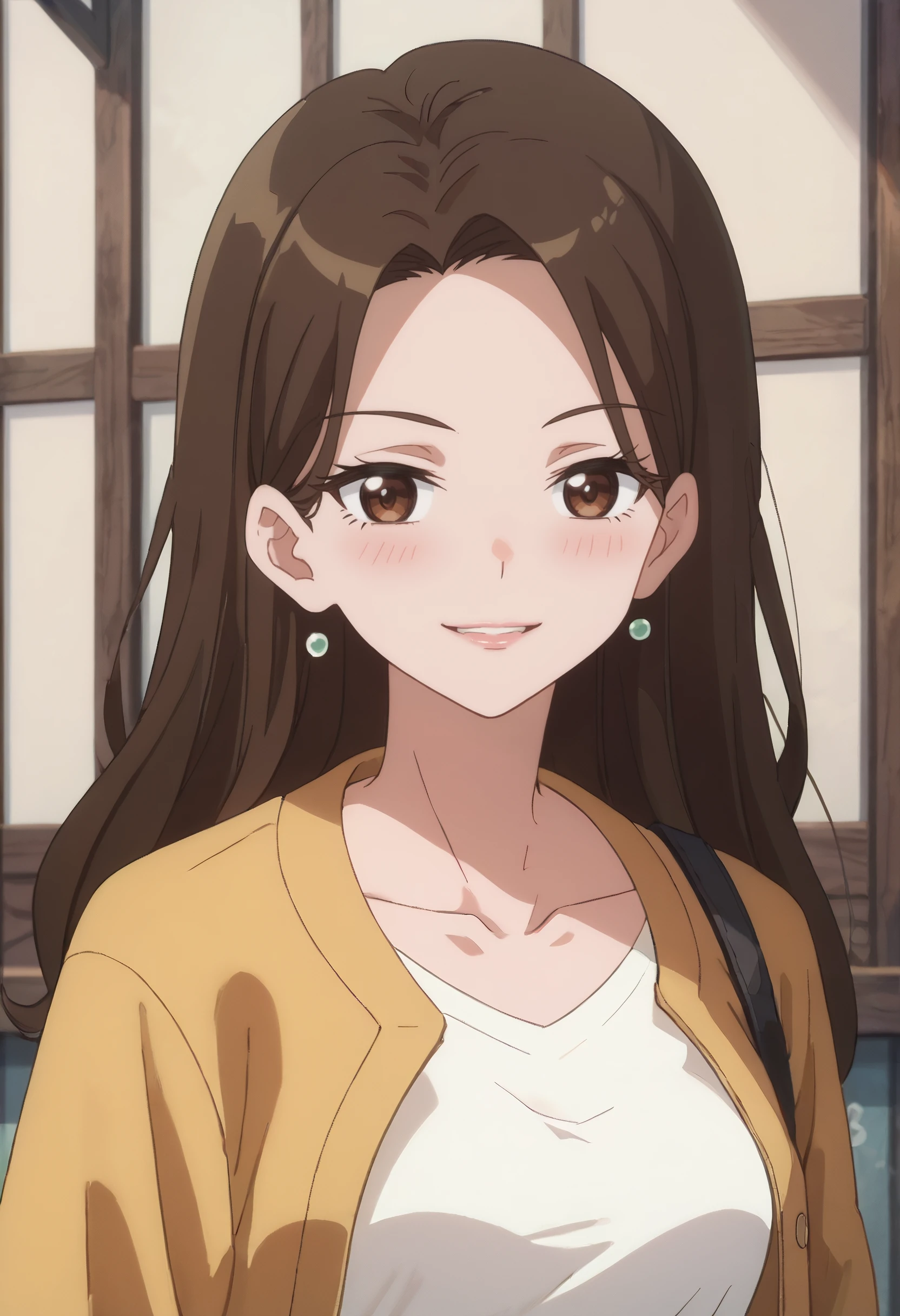 shirt, earrings, jewelry, collarbone, yellow jacket, jacket, white shirt, , casual,