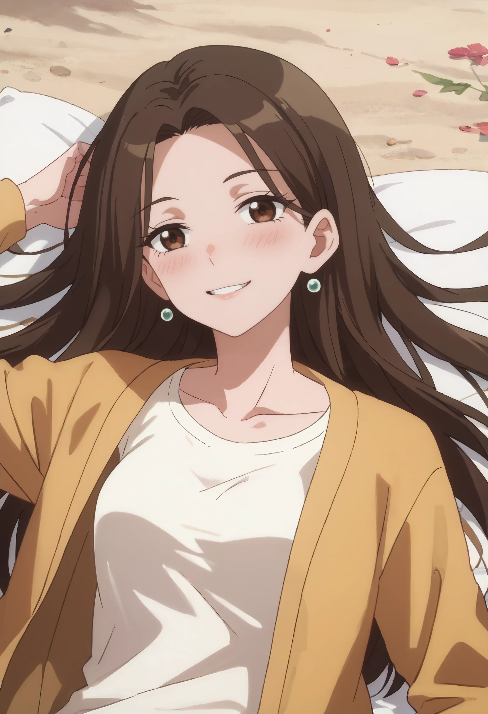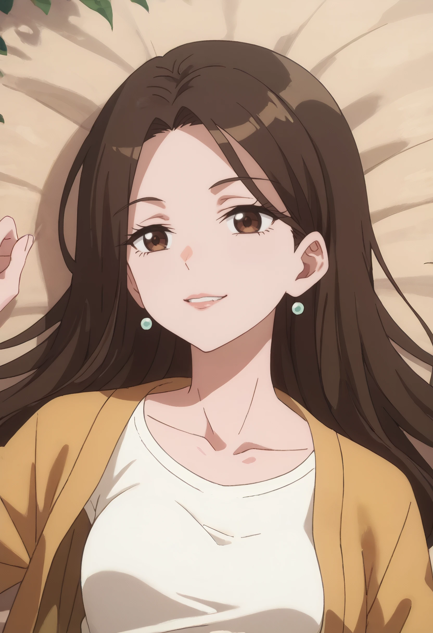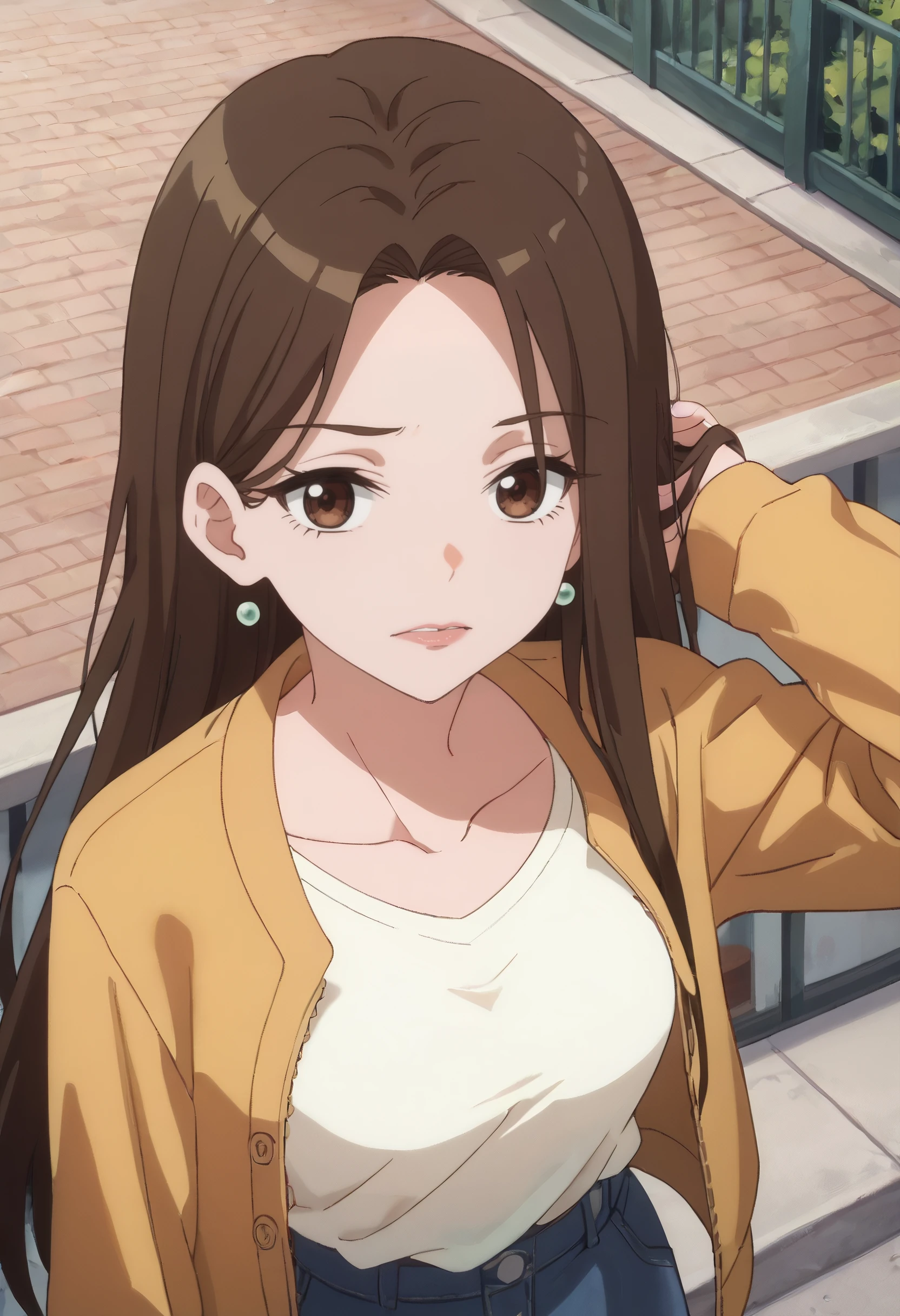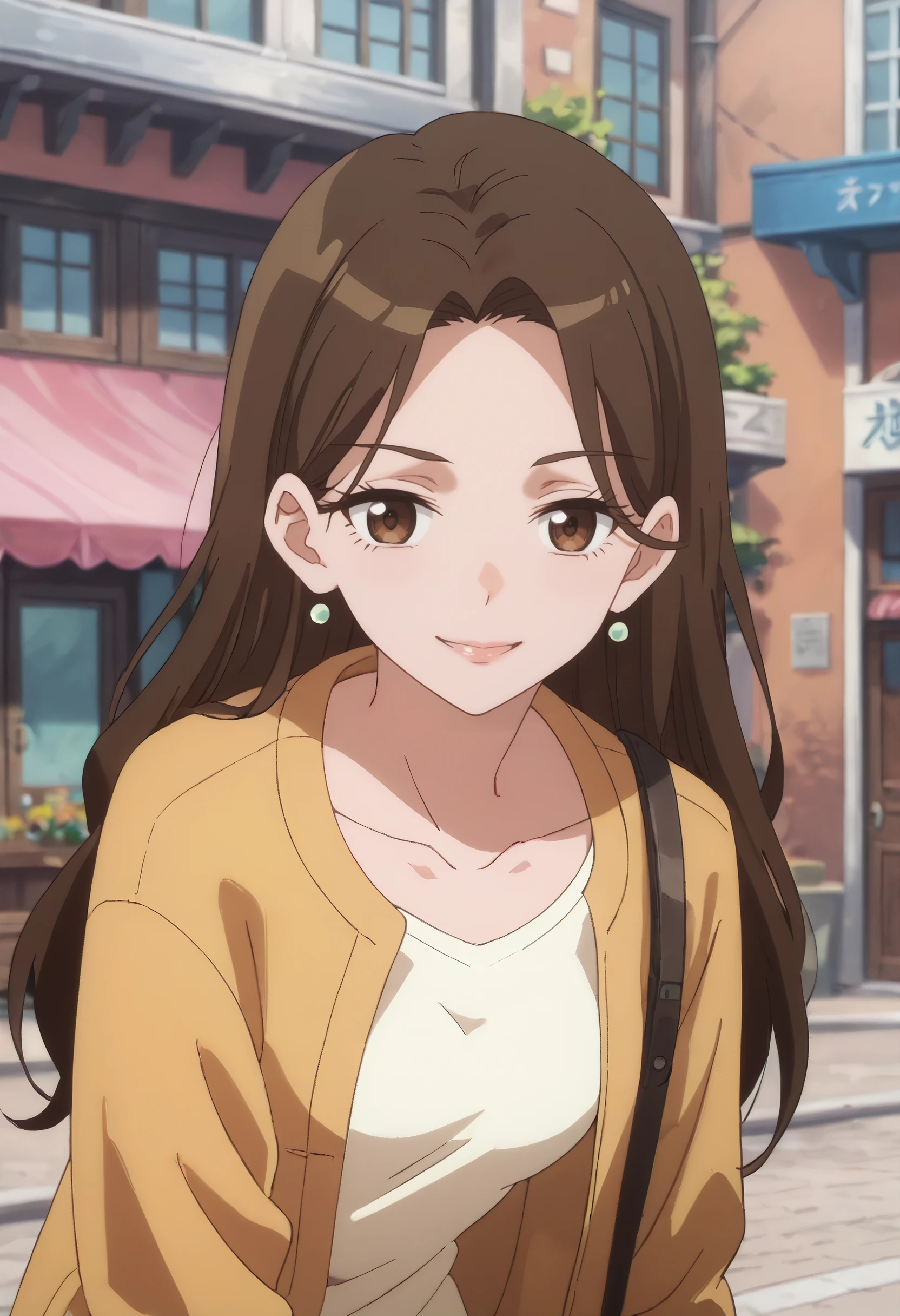 shirt, earrings, jewelry, collarbone, yellow jacket, jacket, white shirt, , casual,