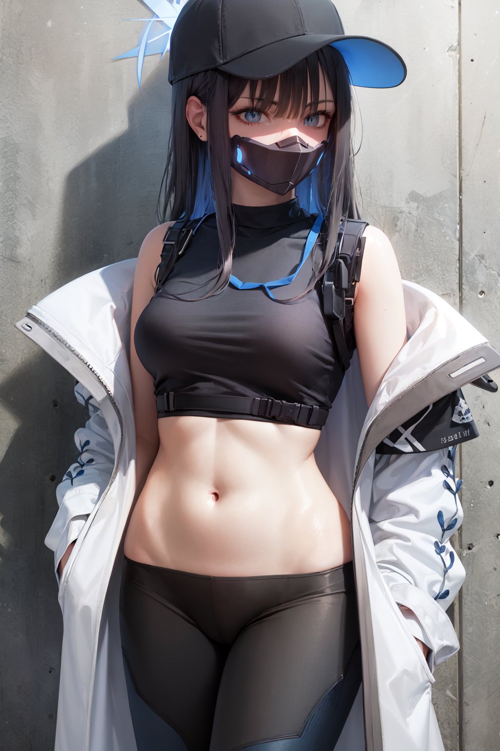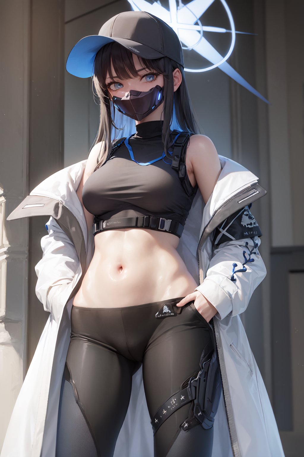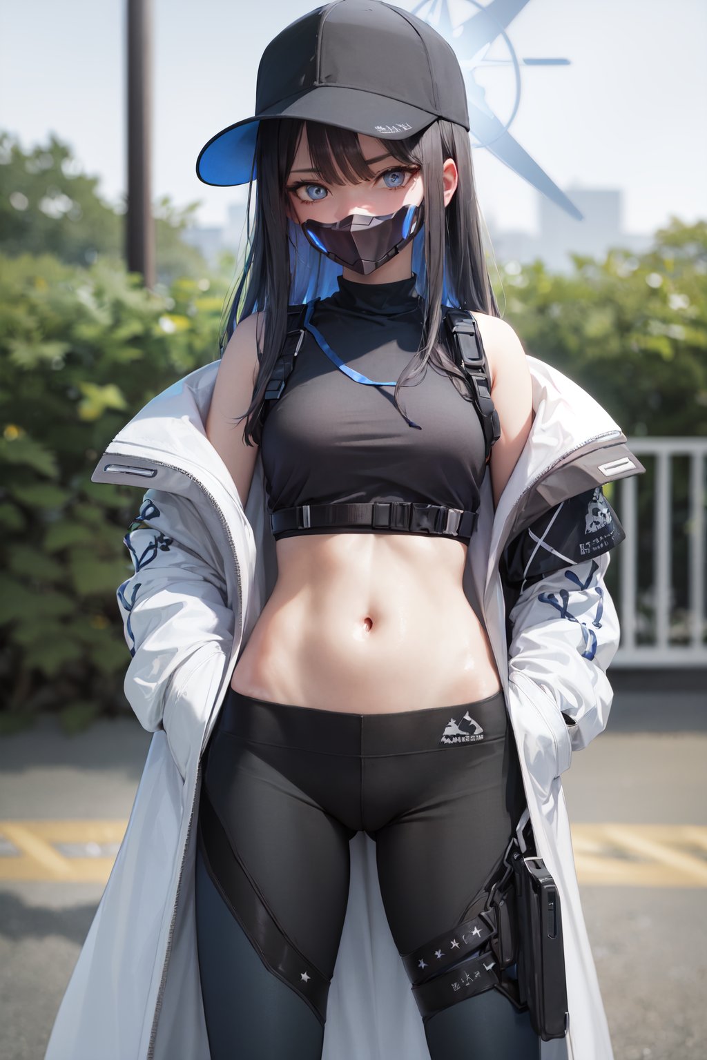 Default Outfit: baseball cap, open clothes, off shoulder, coat, crop top, chest harness, snap-fit buckle, black pants, thigh holster, gloves