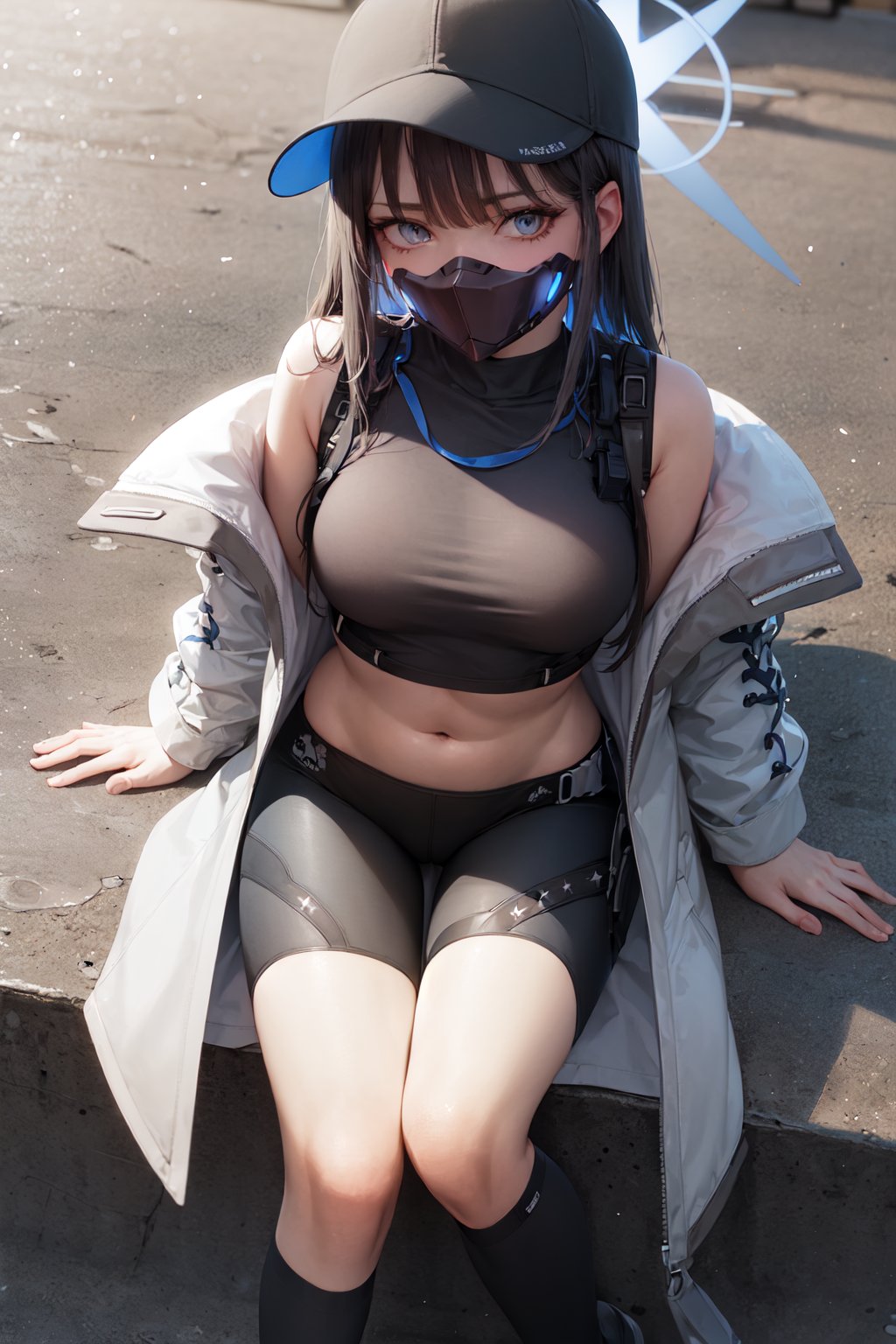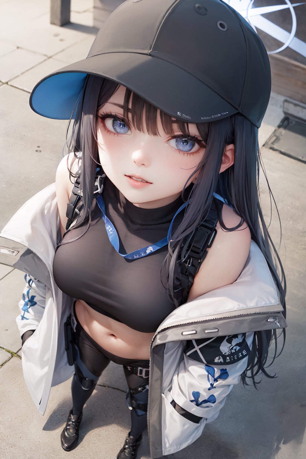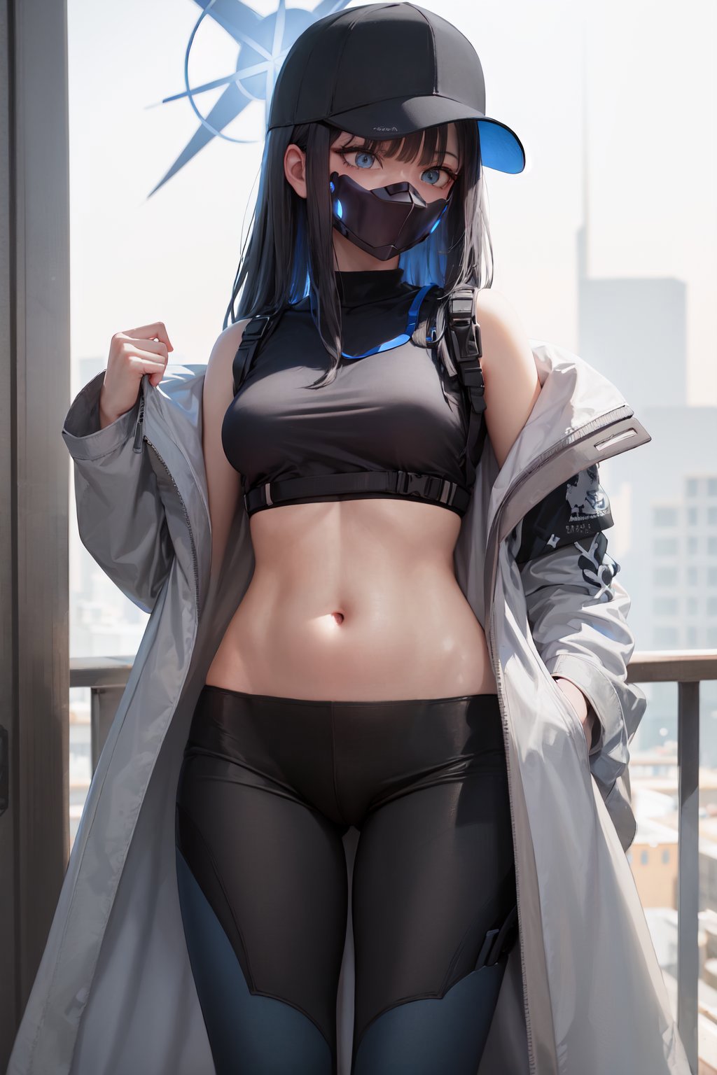 Default Outfit: baseball cap, open clothes, off shoulder, coat, crop top, chest harness, snap-fit buckle, black pants, thigh holster, gloves