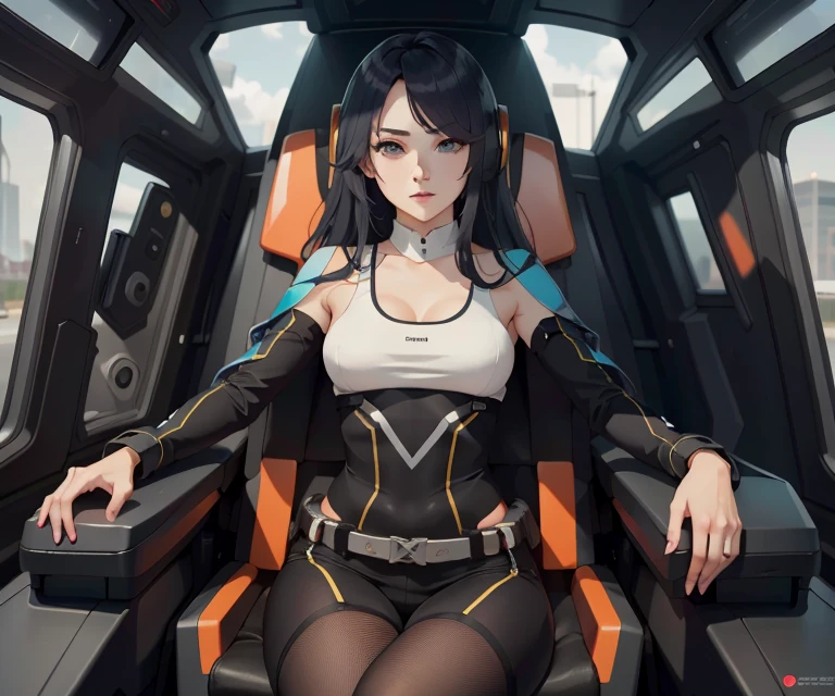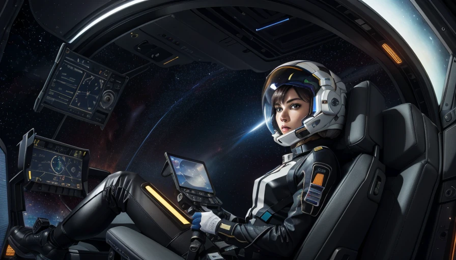 cockpit-pilot, cockpit, solo, pilot suit, bodysuit, science fiction, mscockpit ,holographic interface, holographic monitor, pilot chair,