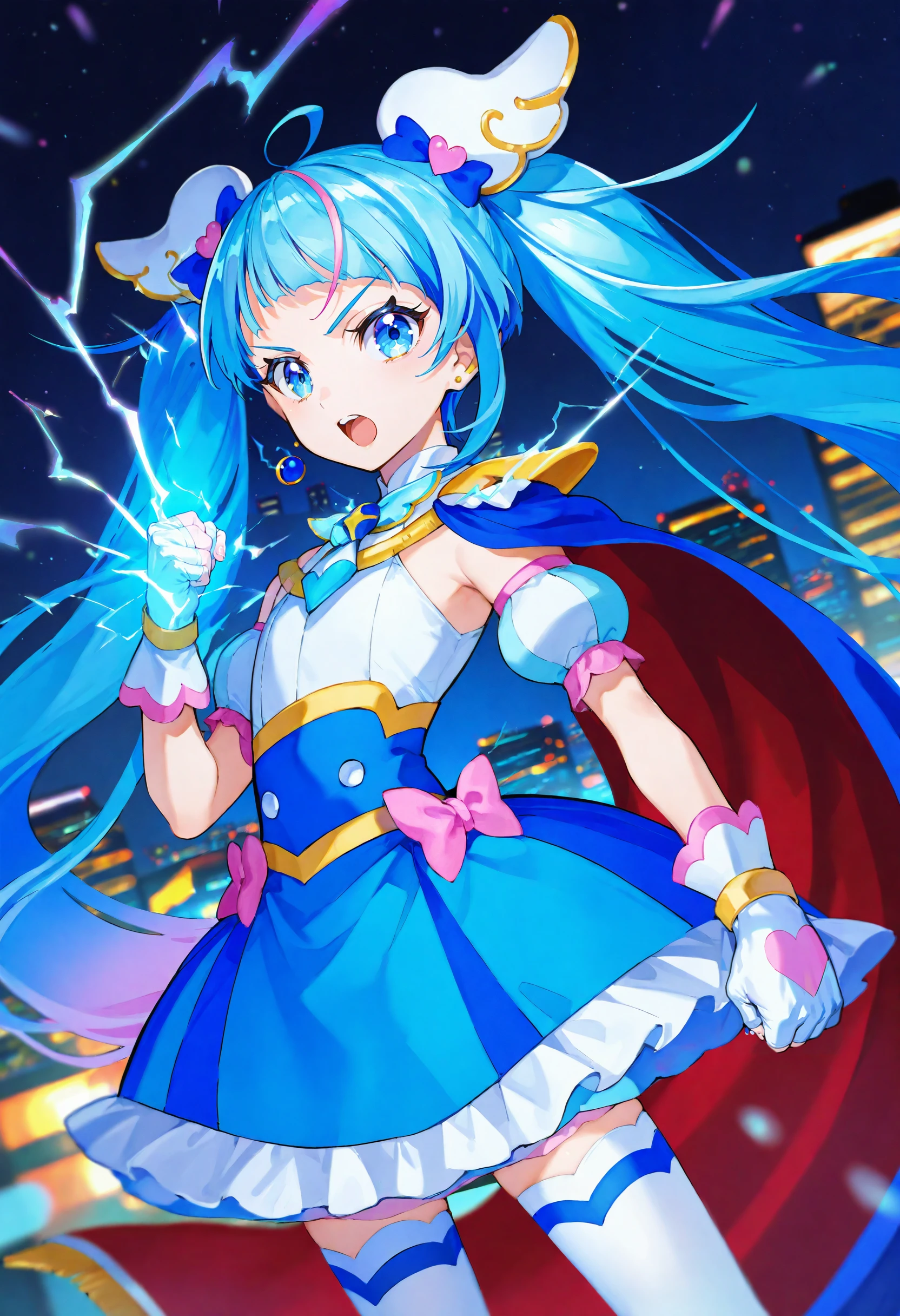 hair ornament, earrings, brooch, multicolored clothes, puffy detached sleeves, bare shoulders, cape, blue skirt, pink bow, white fingerless gloves, white thighhighs, zettai ryouiki, blue footwear, blue eyes, symbol in eyes, multicolored hair, blue hair, twintails, very long hair, flat chest, blue latex shorts