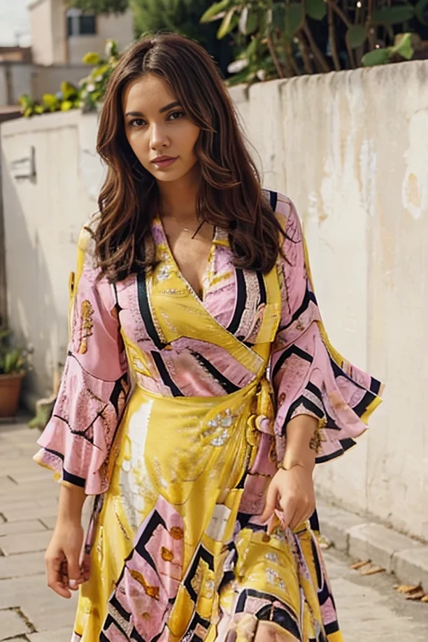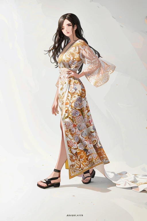 araffe woman in a long dress standing in a studio, female figure in maxi dress, ornate flowing robe, full figure, full body image, wearing dramatic aristocrat robe, full portrait, idian dress, full-figure, floral art novuea dress, kimono robe detailed toggles, floral art nouveau dress, wearing fuchsia silk robe, yummy