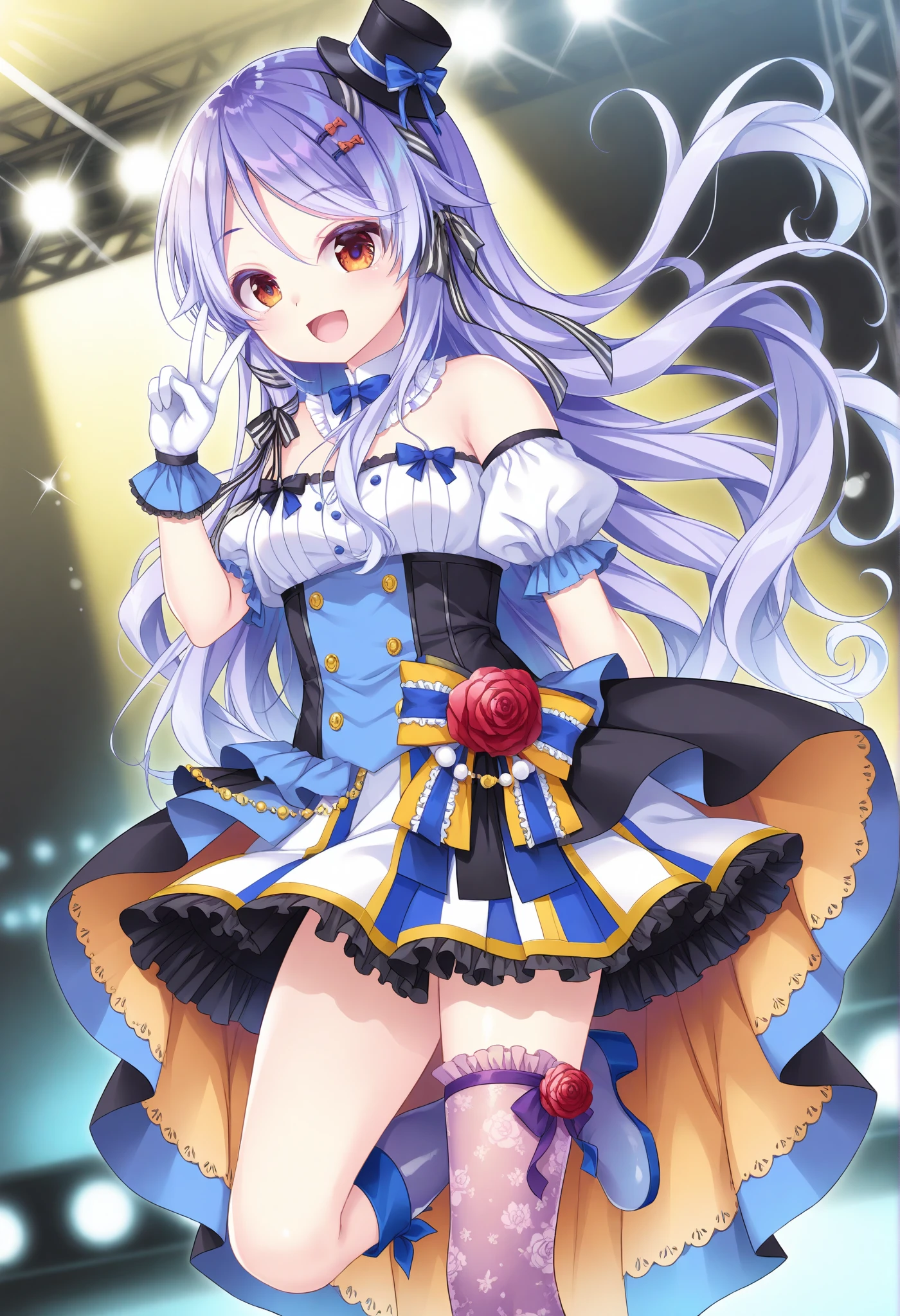 mini top hat,tilted headwear,black headwear,high-low dress,single thighhigh,detached sleeves,puffy short sleeves,detached collar,pleated skirt,white shirt,red flower,blue bowtie,frilled sleeves,off-shoulder shirt,purple thighhighs,print thighhighs,frilled thighhighs,waist bow,yellow bow,double-breasted,two-tone dress,black dress,blue dress,frilled skirt,vertical-striped skirt,white skirt,miniskirt,white gloves,