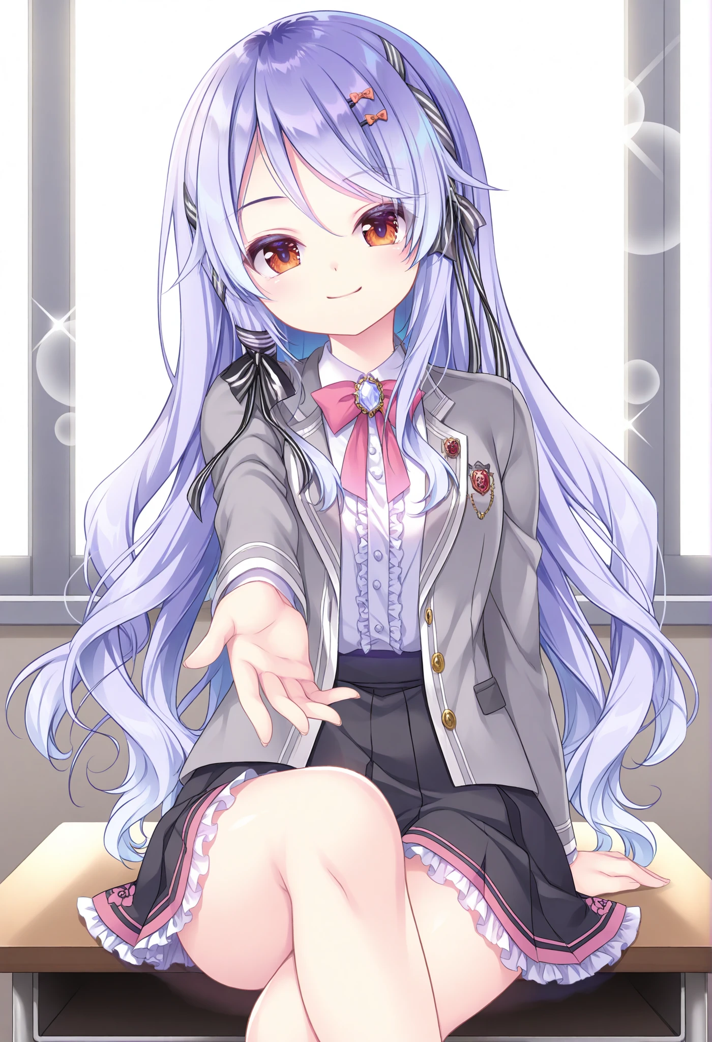school uniform,pleated skirt,,white shirt,black skirt,grey jacket,long sleeves,frilled skirt,center frills,dress shirt,collared shirt,pink bowtie,frilled shirt,miniskirt,diamond brooch,
