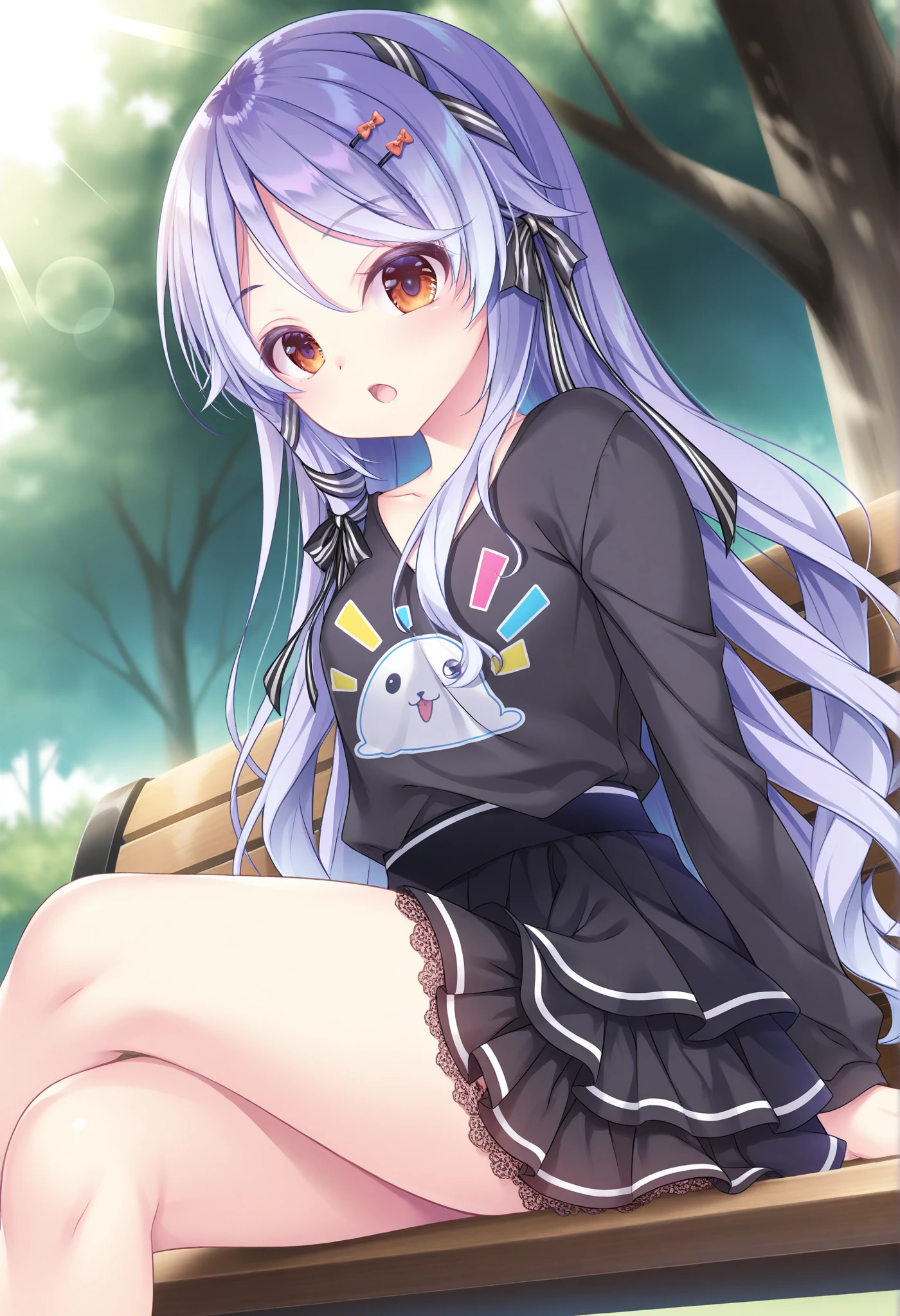 Yamabuki Alice,purple hair,very long hair,hair ribbon,black ribbon,striped ribbon,parallel hairclips,orange eyes,