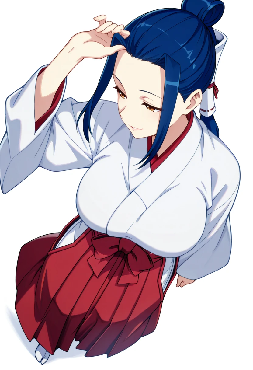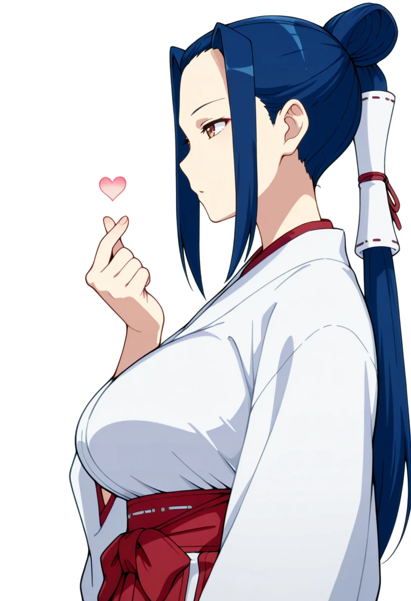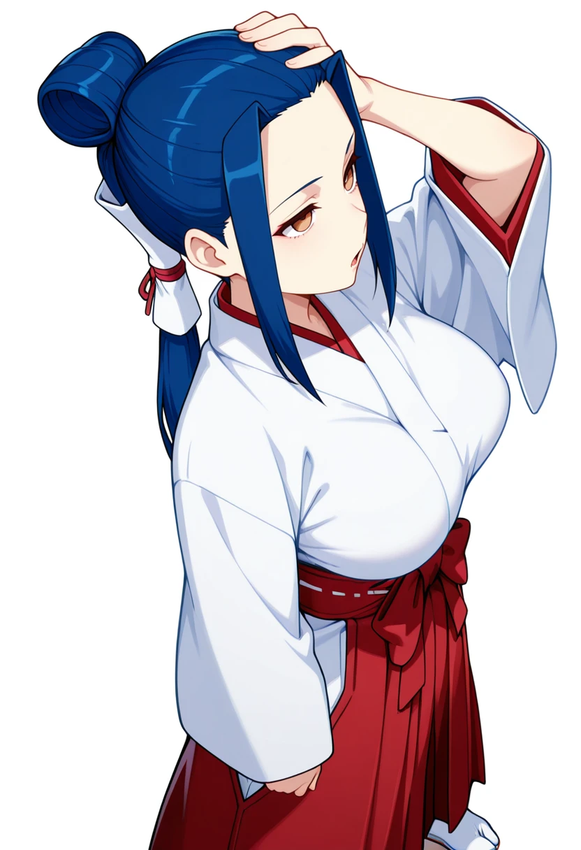 kokuyou_cnr, 1girl,brown eyes, blue hair, long hair,large breasts, sidelocks, single hair bun, hair tubes,ponytail,