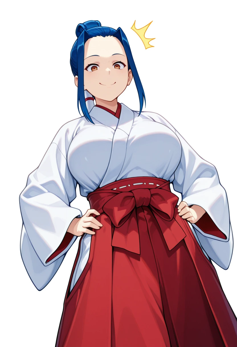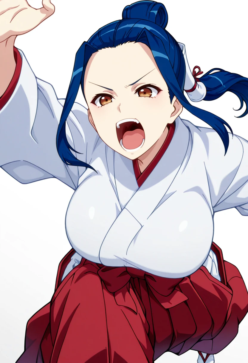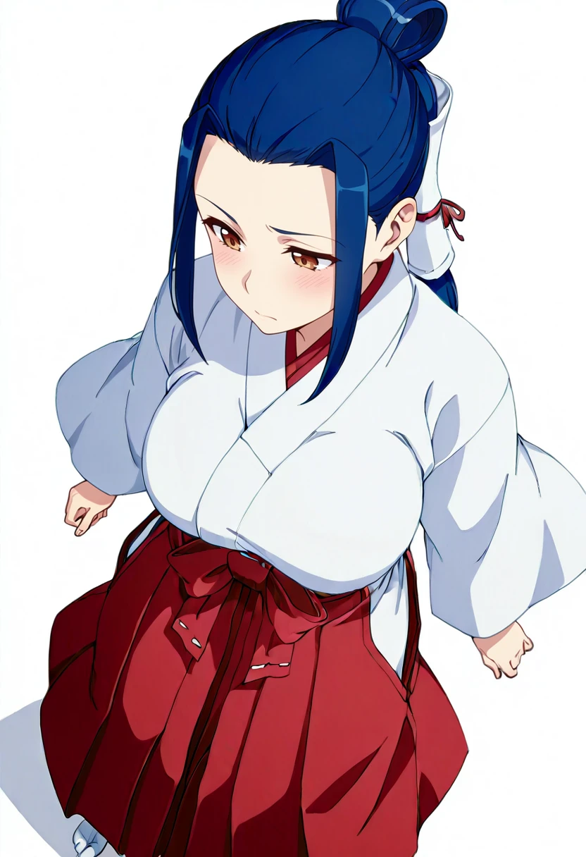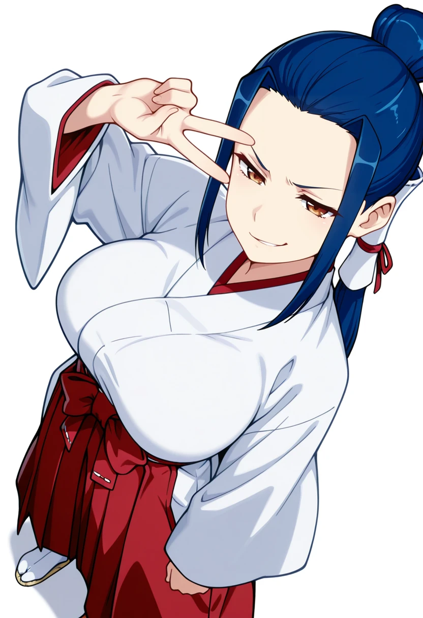 kokuyou_cnr, 1girl,brown eyes, blue hair, long hair,large breasts, sidelocks, single hair bun, hair tubes,ponytail,