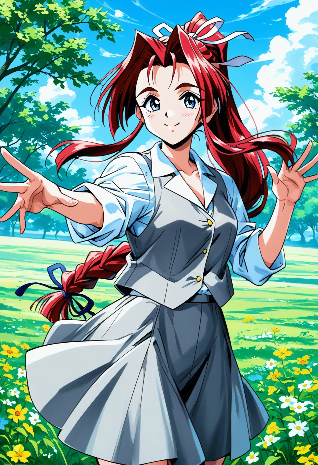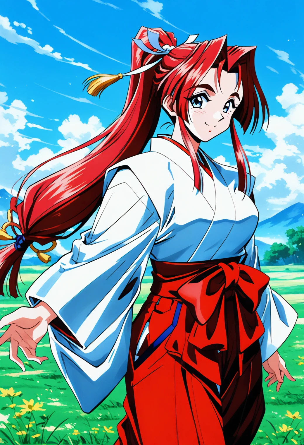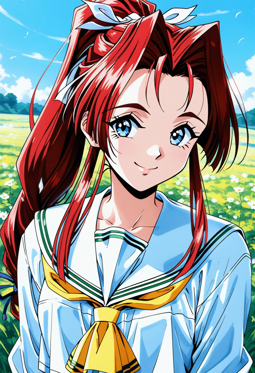 Trigger word: yokoyama_megumi, blue eyes, red hair, long hair, ponytail, low-tied long hair, hair ribbon,