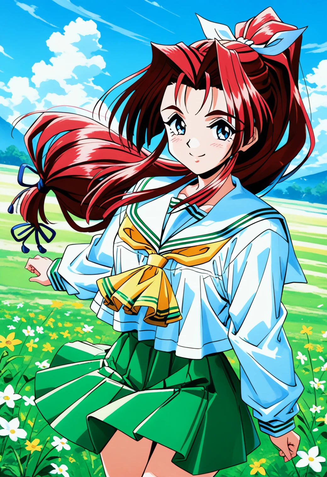 yokoyama_megumi, blue eyes, red hair, long hair, ponytail, low-tied long hair, hair ribbon, school uniform, serafuku, white sailor collar, yellow neckerchief, white shirt, long sleeves, green skirt, pleated skirt,