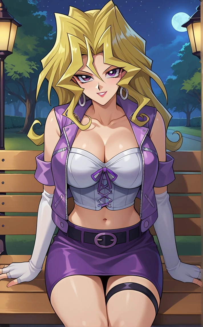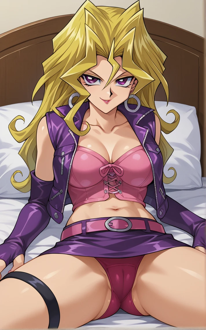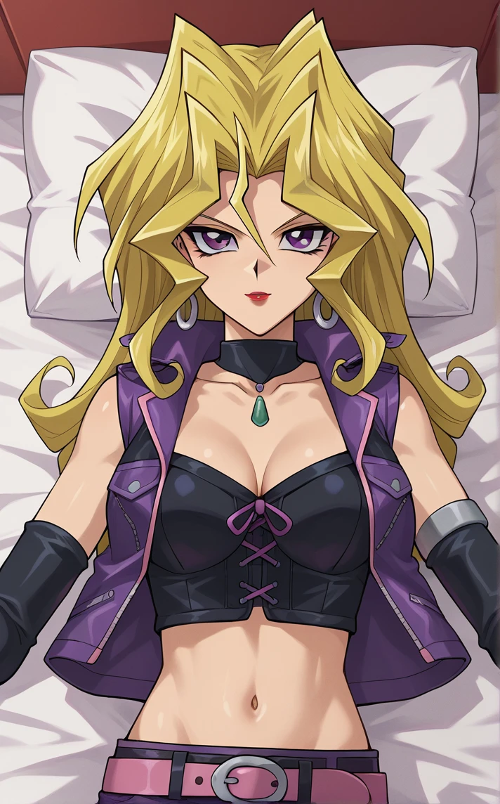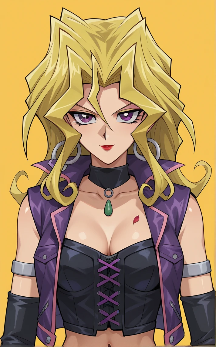 PurpleCorset_YuGiOh_MaiValentine_ownwaifu, 1girl, blonde hair, hair between eyes, purple eyes, sidelocks, spiked hair, wavy hair, long hair, belt, lipstick, bustier, jewelry, bangs, makeup, collarbone, medium breasts, cleavage, cropped jacket, detached sleeves, leather jacket, midriff, navel, open jacket, popped collar, pink corset, purple gloves, purple skirt, zipper, crop top, open clothes, sleeveless jacket, hoop earrings, pencil skirt, buckle, thigh strap, earrings, elbow gloves, thigh holster, cropped vest, leather, shiny clothes,
