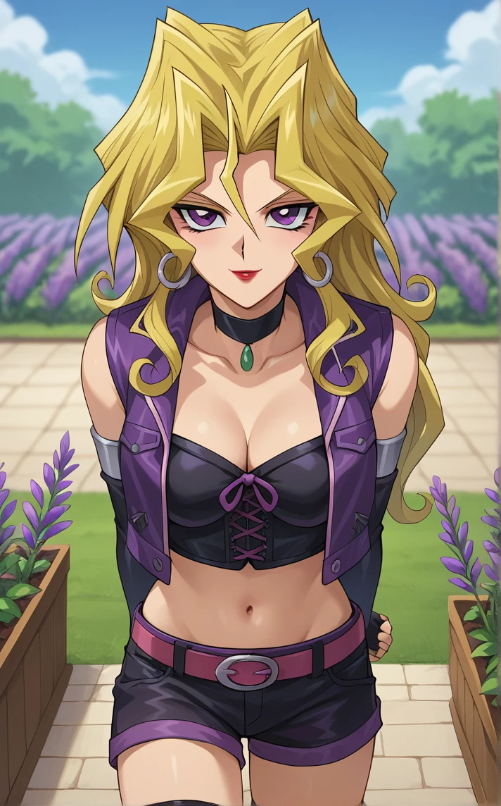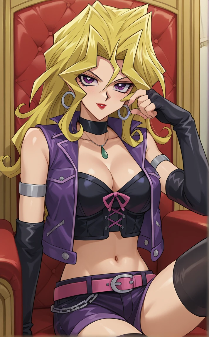 BlackCorset_YuGiOh_MaiValentine_ownwaifu, 1girl, blonde hair, hair between eyes, purple eyes, spiked hair, wavy hair, sidelocks, long hair, armlet, black choker, black gloves, black sleeves, cropped jacket, detached sleeves, open jacket, pendant, popped collar, purple jacket, sleeveless, white corset, jewelry, cleavage, crop top, midriff, navel, elbow gloves, necklace, collarbone, belt, bangs, earrings, medium breasts, sleeveless jacket, parted bangs, fingerless gloves, hoop earrings, lipstick, makeup, red lips, buckle, black thighhighs, bare shoulders, belt buckle, purple shorts