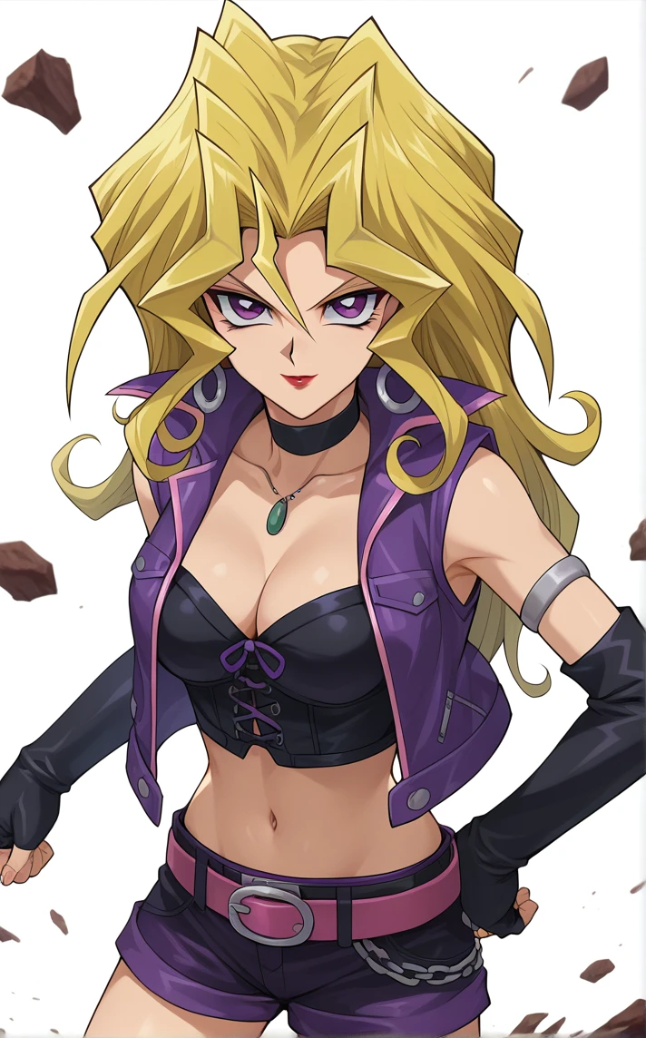 WhiteCorset_YuGiOh_MaiValentine_ownwaifu, 1girl, blonde hair, hair between eyes, purple eyes, spiked hair, wavy hair, long hair, lipstick, earrings, makeup, sidelocks, cropped jacket, open jacket, popped collar, purple jacket, purple skirt, sleeves rolled up, white corset, jewelry, cleavage, fingerless gloves, belt, medium breasts, midriff, miniskirt, red lips, navel, collarbone, pencil skirt, detached sleeves, thigh strap, bare shoulders, bustier, hoop earrings, parted bangs, ⚙️My Settings: I use 4xUpscaler because its clean and fast, for best results dont mix multiple LoRAs and try different LoRA weights for optimal results. Change Clip 2 for Anime and Clip 1 for everything else.