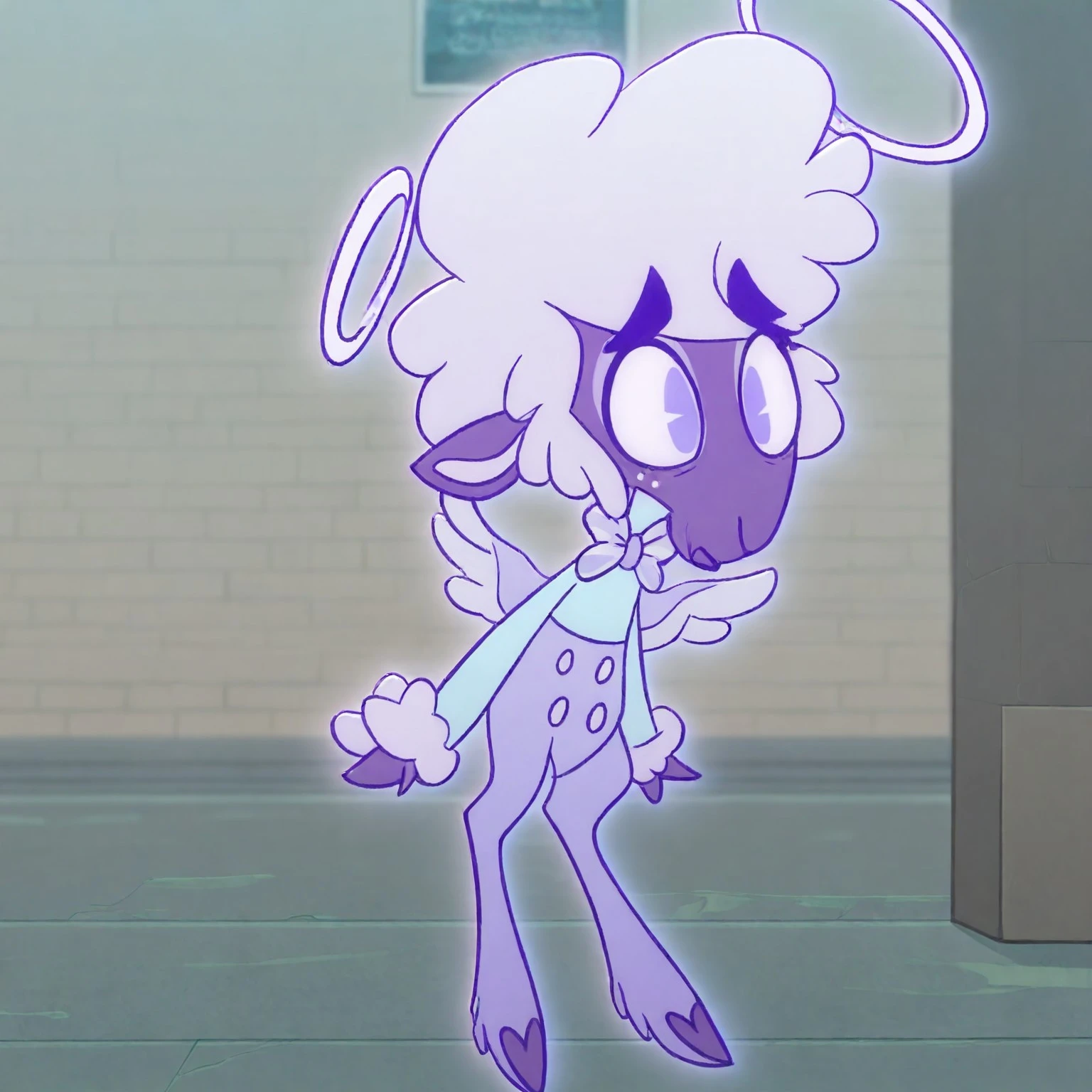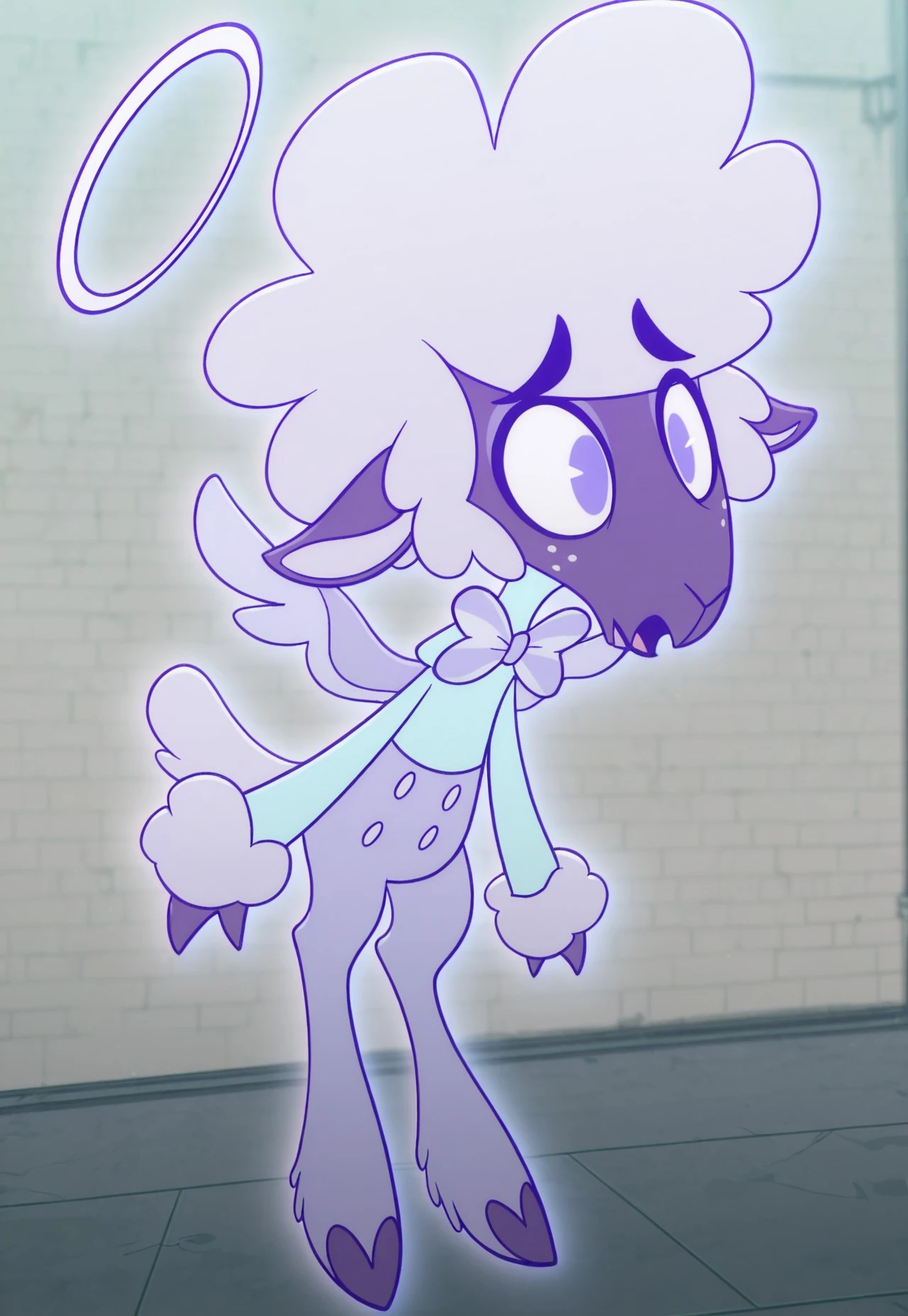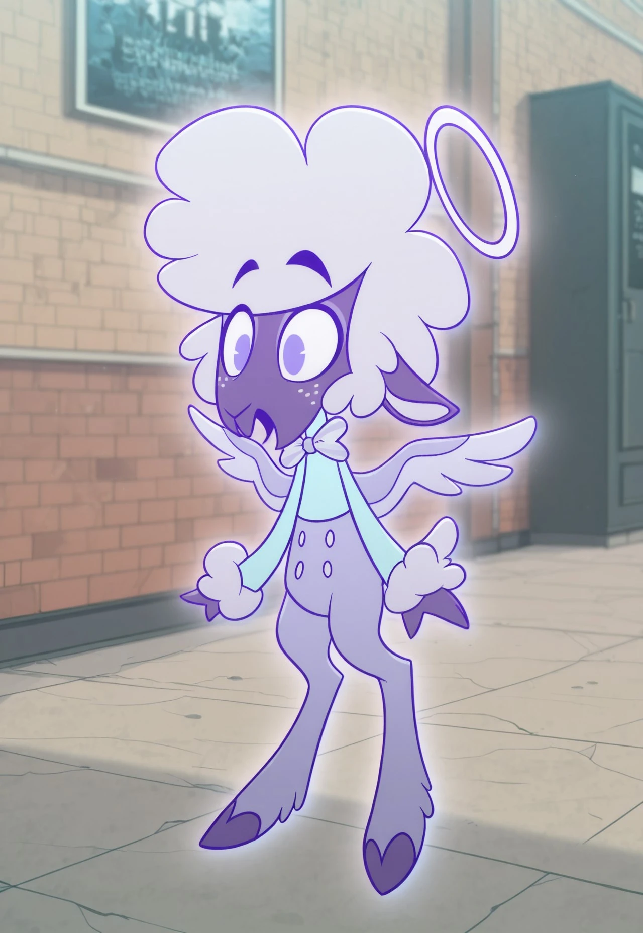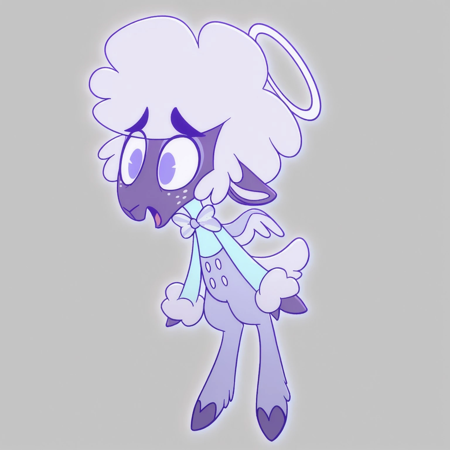 Collin, 2d, cartoon, purple skin, anthropomorphic sheep, halo, purple wings, white freckles periwinkle short hair, long sleeved light blue turtleneck, periwinkle bowtie, light purple pants